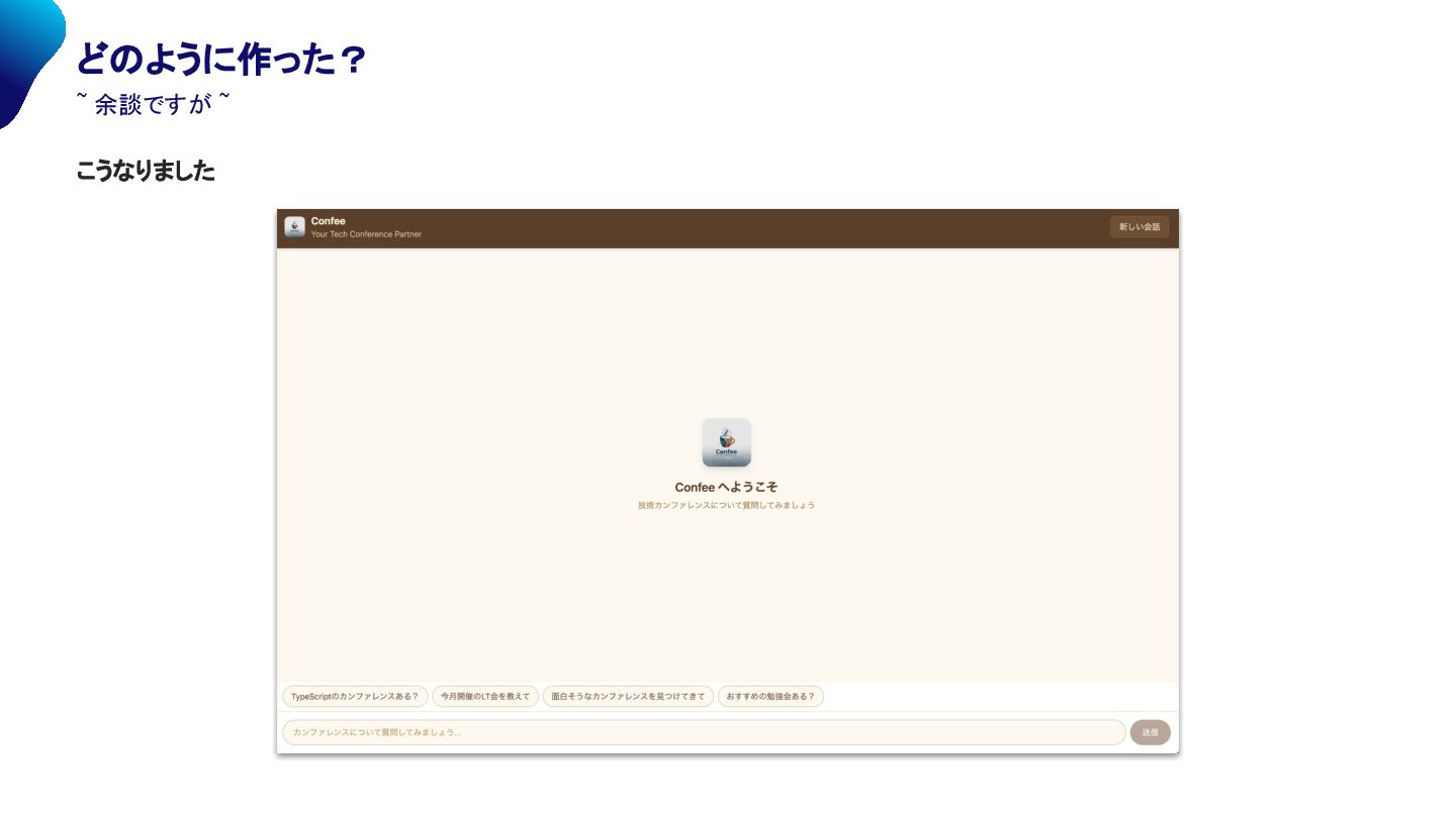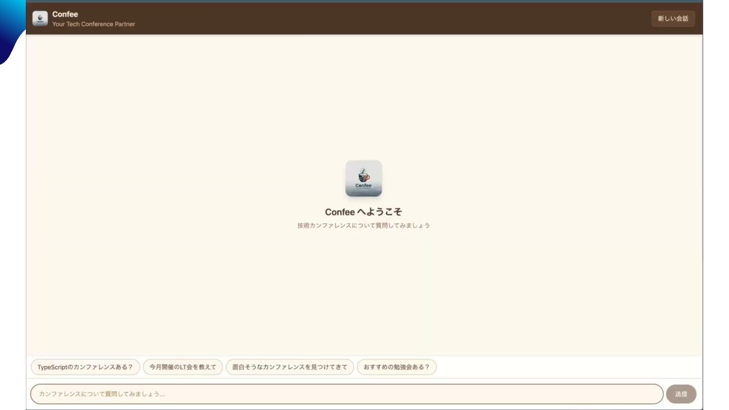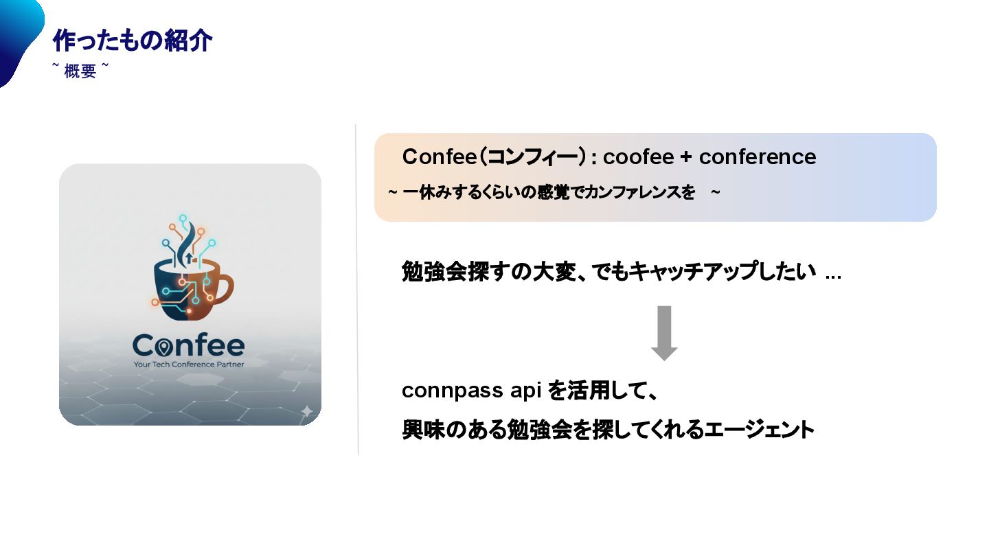 ... connpass api を活用して、 興味のある勉強会を探してくれるエージェント ~ 概要 ~ Confee(コンフィー): coofee + conference ~ 一休みするくらいの感覚でカンファレンスを ~