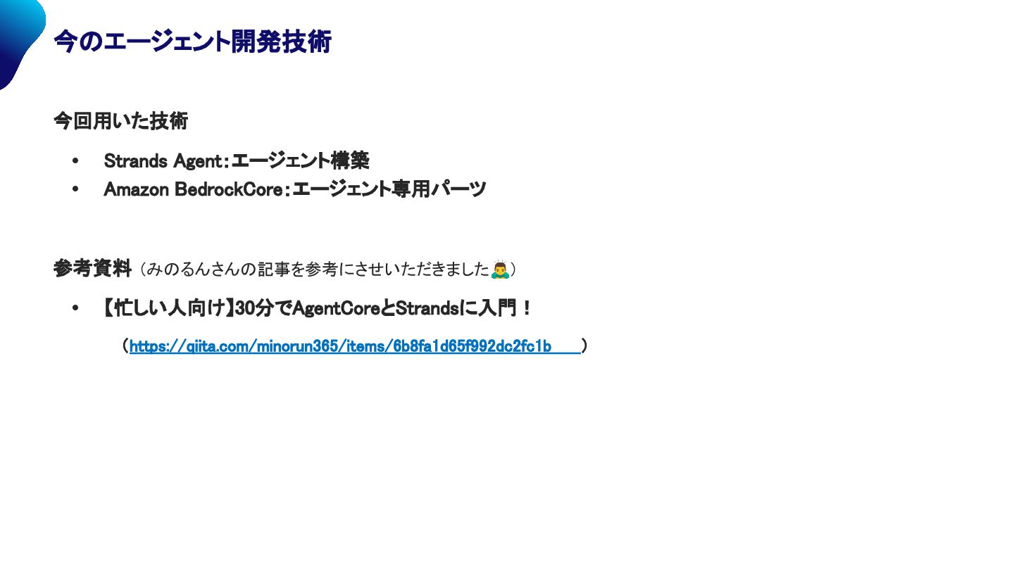 • Strands Agent:エージェント構築 • Amazon BedrockCore:エージェント専用パーツ 参考資料 (みのるんさんの記事を参考にさせいただきました) • 【忙しい人向け】30分でAgentCoreとStrandsに入門! (https://qiita.com/minorun365/items/6b8fa1d65f992dc2fc1b )