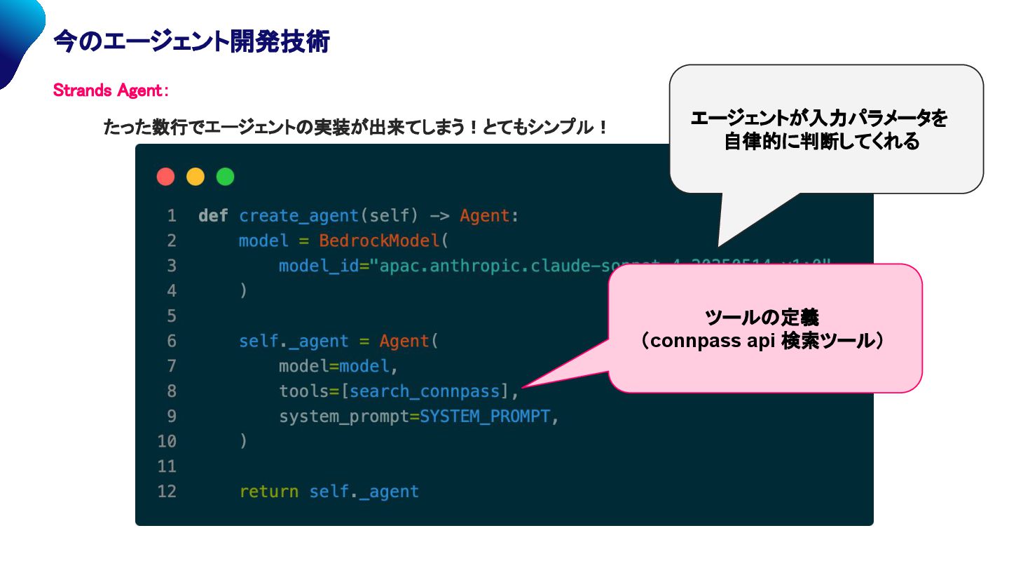 (connpass api 検索ツール) エージェントが入力パラメータを 自律的に判断してくれる Strands Agent: たった数行でエージェントの実装が出来てしまう!とてもシンプル!