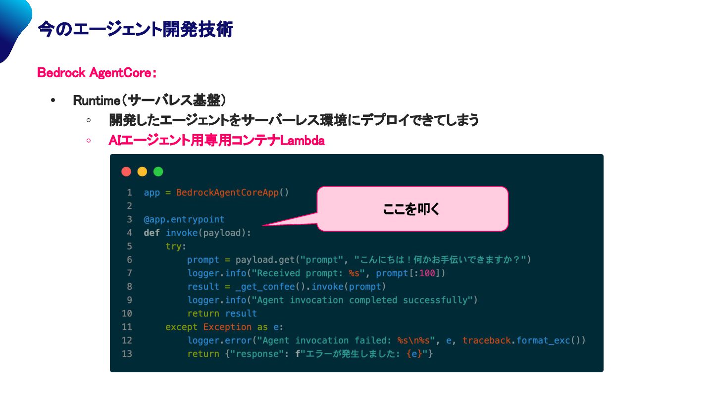 Bedrock AgentCore: • Runtime(サーバレス基盤) ◦ 開発したエージェントをサーバーレス環境にデプロイできてしまう ◦ AIエージェント用専用コンテナLambda ここを叩く