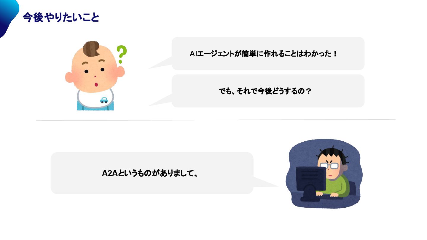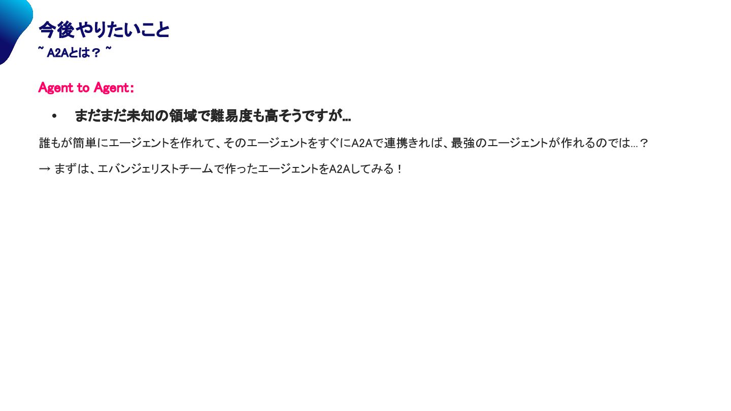 A2Aとは? ~ Agent to Agent: • まだまだ未知の領域で難易度も高そうですが... 誰もが簡単にエージェントを作れて、そのエージェントをすぐにA2Aで連携きれば、最強のエージェントが作れるのでは...? → まずは、エバンジェリストチームで作ったエージェントをA2Aしてみる!
