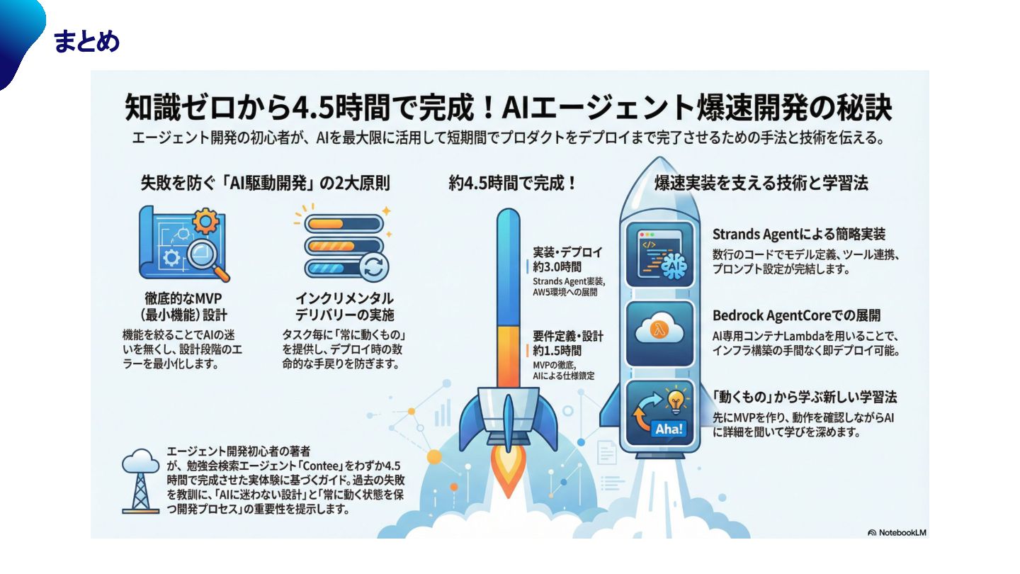 とはいえ ~ でも、かなり頑張ったんでしょう ...?? 今回は、要件や設計に 約1.5時間、実装は 約3時間でデプロイまで完了しました! 途中つまづいた部分はありましたが、エラーを投げていただけです 🤫 エージェント開発初心者 ※ の僕がなぜ短時間で開発できたのか、 2つの側面から振り返ります。 🚀 お手軽 & 手戻り0にするために施した AI駆動開発の工夫 🚀 今のエージェント開発技術 本当に初心者なの...?? ※ Strands Agent , Bedrock AgentCore という「言葉だけ」チーム会議で耳にして知っている程度