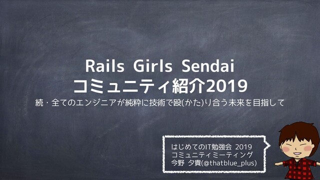 はじめてのITコミュニティミーティングで発表したRails Girls Sendaiのコミュニティ紹介です。 https://lets-go-study-meeting.connpass.com/event/157153/
