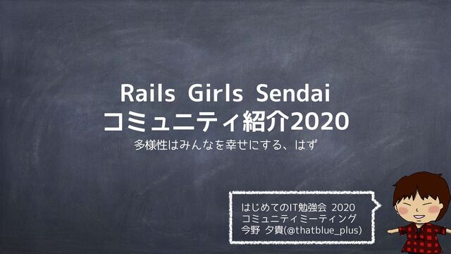 はじめてのITコミュニティミーティングで発表したRails Girls Sendaiのコミュニティ紹介です。 https://lets-go-study-meeting.connpass.com/event/197821/