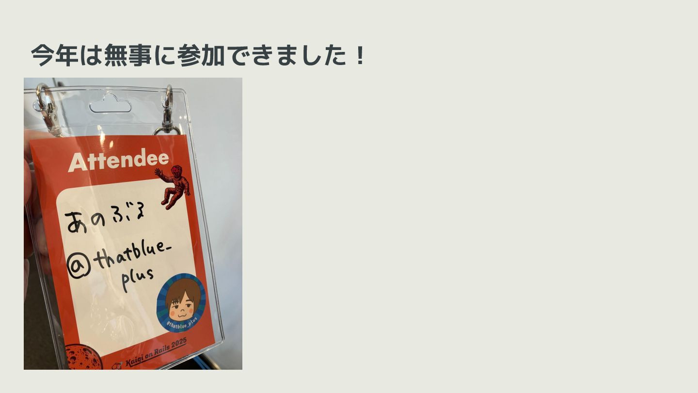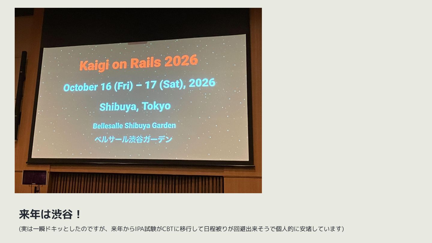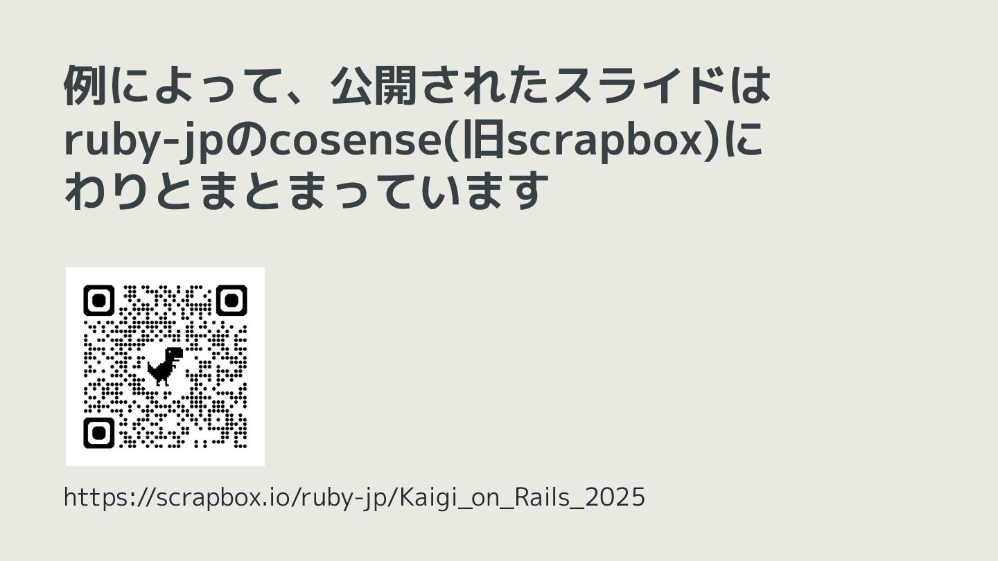例によって、公開されたスライドは ruby-jpのcosense(旧scrapbox)に わりとまとまっています https://scrapbox.io/ruby-jp/Kaigi_on_Rails_2025