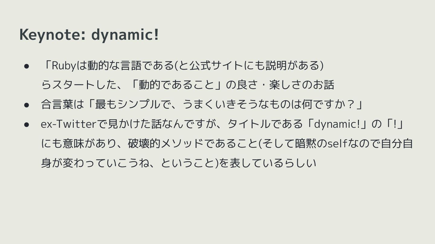 Keynote: dynamic! • 「Rubyは動的な言語である(と公式サイトにも説明がある)」というところか らスタートした、「動的であること」の良さ・楽しさのお話 • 合言葉は「最もシンプルで、うまくいきそうなものは何ですか?」 • ex-Twitterで見かけた話なんですが、タイトルである「dynamic!」の「!」 にも意味があり、破壊的メソッドであること(そして暗黙のselfなので自分自