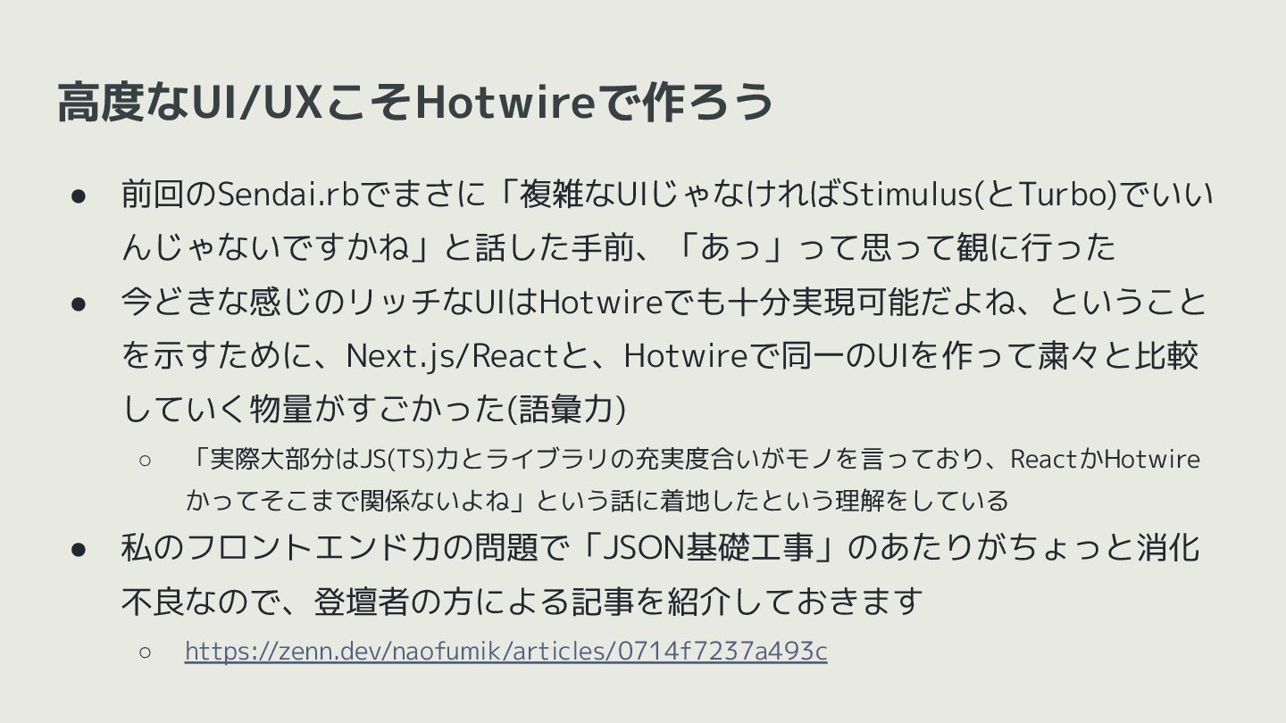 高度なUI/UXこそHotwireで作ろう • 前回のSendai.rbでまさに「複雑なUIじゃなければStimulus(とTurbo)でいい んじゃないですかね」と話した手前、「あっ」って思って観に行った • 今どきな感じのリッチなUIはHotwireでも十分実現可能だよね、ということ を示すために、Next.js/Reactと、Hotwireで同一のUIを作って粛々と比較 していく物量がすごかった(語彙力) ◦ 「実際大部分はJS(TS)力とライブラリの充実度合いがモノを言っており、ReactかHotwire