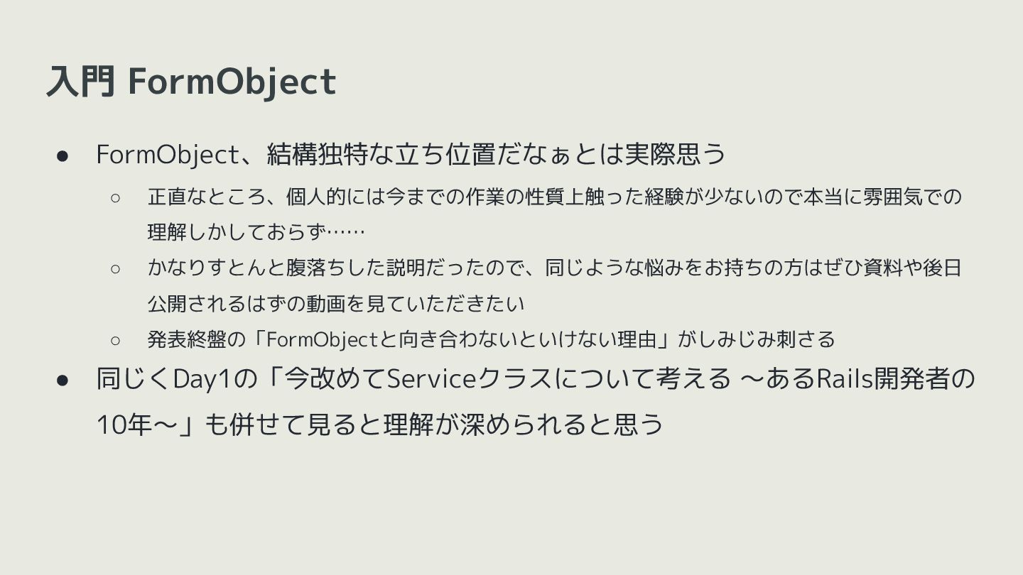 ◦ 発表終盤の「FormObjectと向き合わないといけない理由」がしみじみ刺さる • 同じくDay1の「今改めてServiceクラスについて考える 〜あるRails開発者の 10年〜」も併せて見ると理解が深められると思う