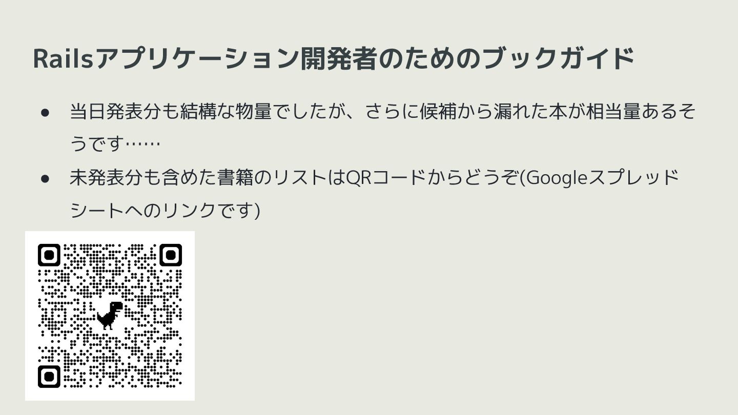 Railsアプリケーション開発者のためのブックガイド • 当日発表分も結構な物量でしたが、さらに候補から漏れた本が相当量あるそ うです…… • 未発表分も含めた書籍のリストはQRコードからどうぞ(Googleスプレッド シートへのリンクです)