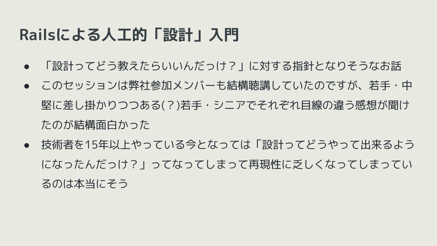 Railsによる人工的「設計」入門 • 「設計ってどう教えたらいいんだっけ?」に対する指針となりそうなお話 • このセッションは弊社参加メンバーも結構聴講していたのですが、若手・中 堅に差し掛かりつつある(?)若手・シニアでそれぞれ目線の違う感想が聞け たのが結構面白かった • 技術者を15年以上やっている今となっては「設計ってどうやって出来るよう になったんだっけ?」ってなってしまって再現性に乏しくなってしまってい