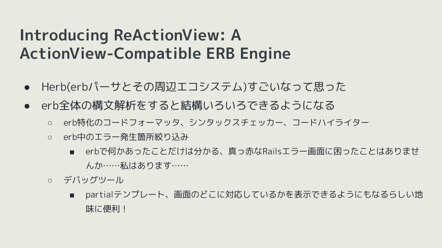 Introducing ReActionView: A ActionView-Compatible ERB Engine • Herb(erbパーサとその周辺エコシステム)すごいなって思った • erb全体の構文解析をすると結構いろいろできるようになる