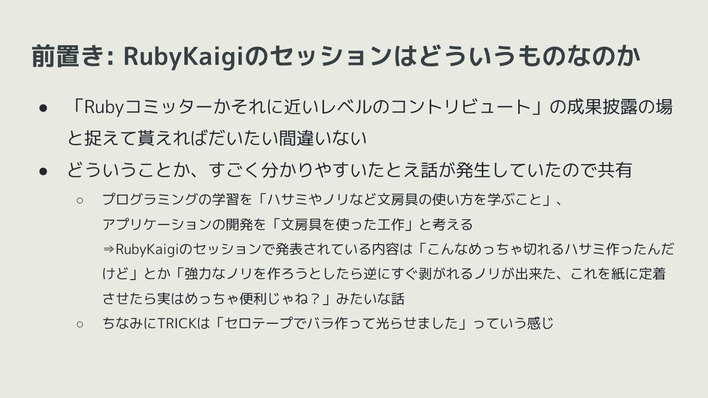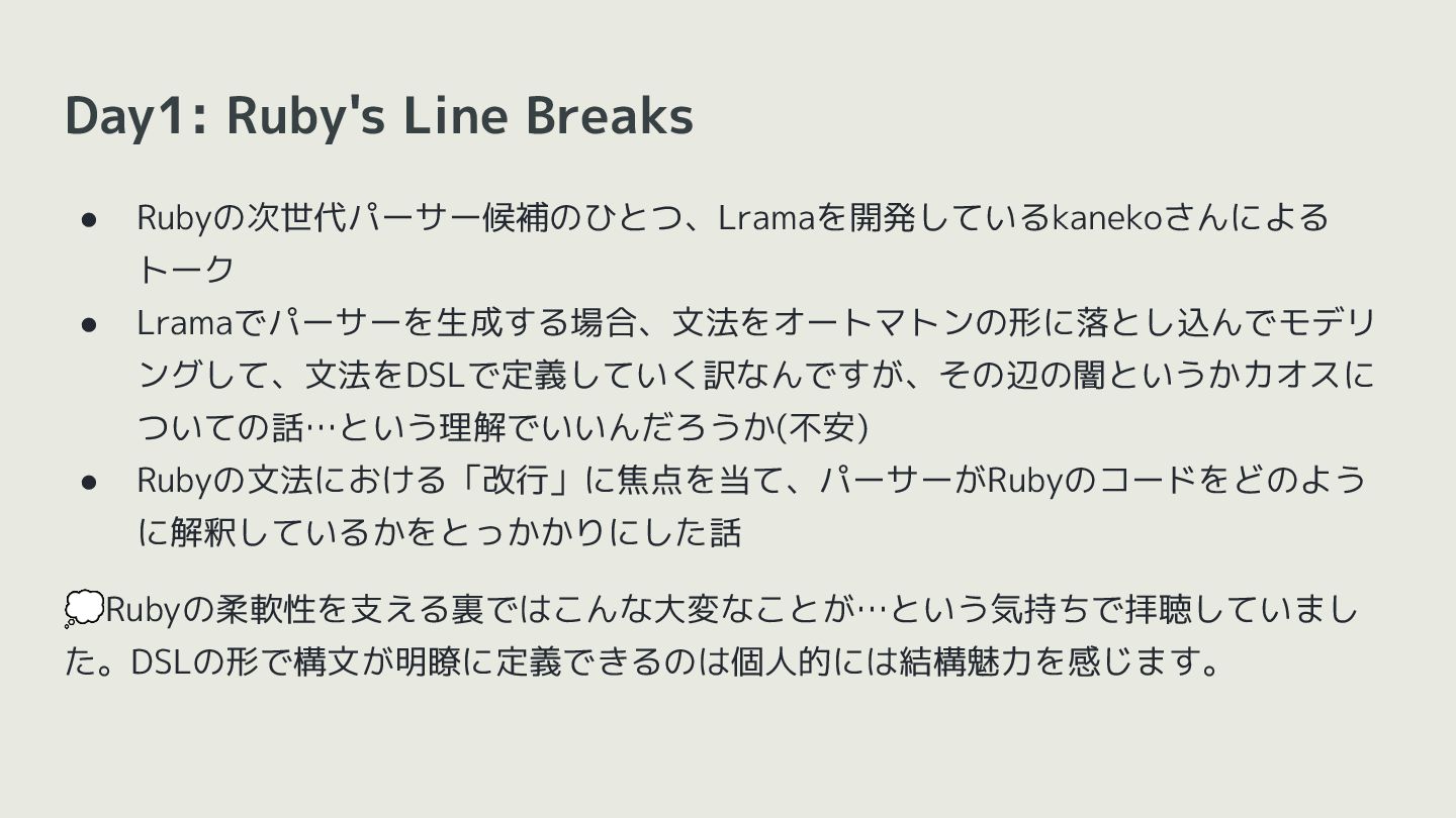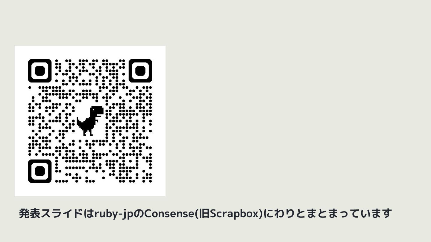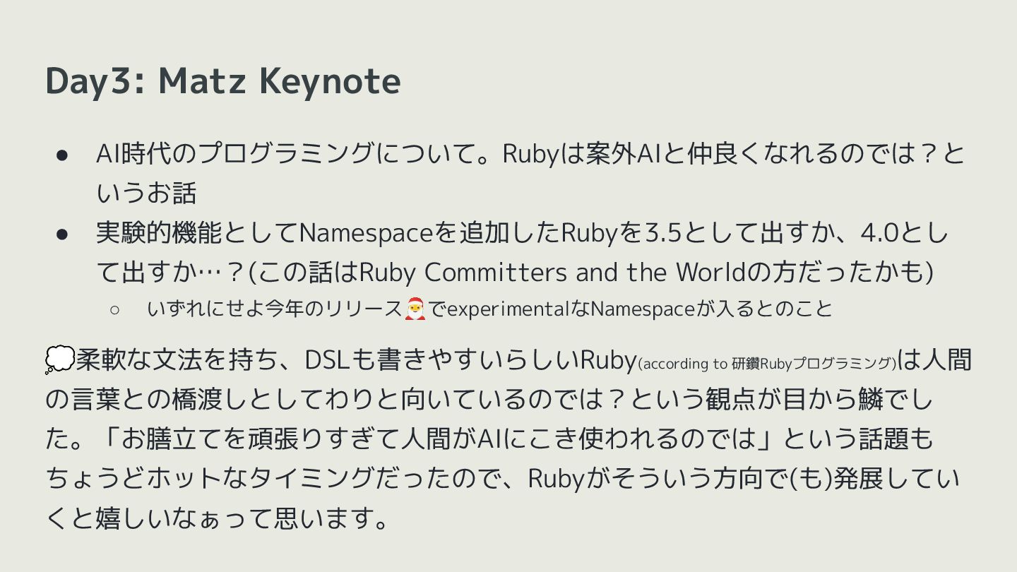 and the Worldの方だったかも) ◦ いずれにせよ今年のリリース🎅でexperimentalなNamespaceが入るとのこと 💭柔軟な文法を持ち、DSLも書きやすいらしいRuby(according to 研鑽Rubyプログラミング) は人間 の言葉との橋渡しとしてわりと向いているのでは?という観点が目から鱗でし た。「お膳立てを頑張りすぎて人間がAIにこき使われるのでは」という話題も ちょうどホットなタイミングだったので、Rubyがそういう方向で(も)発展してい くと嬉しいなぁって思います。
