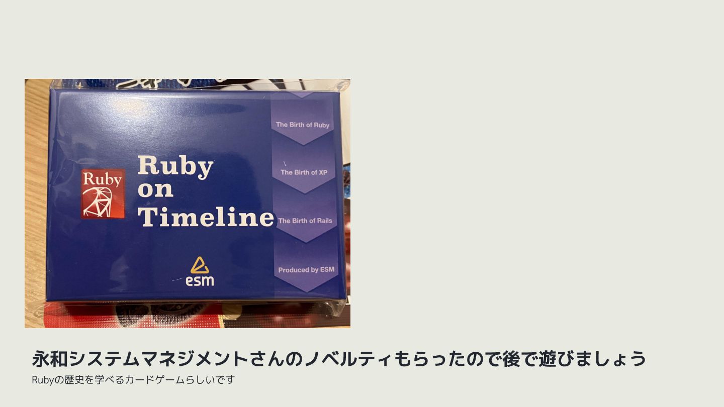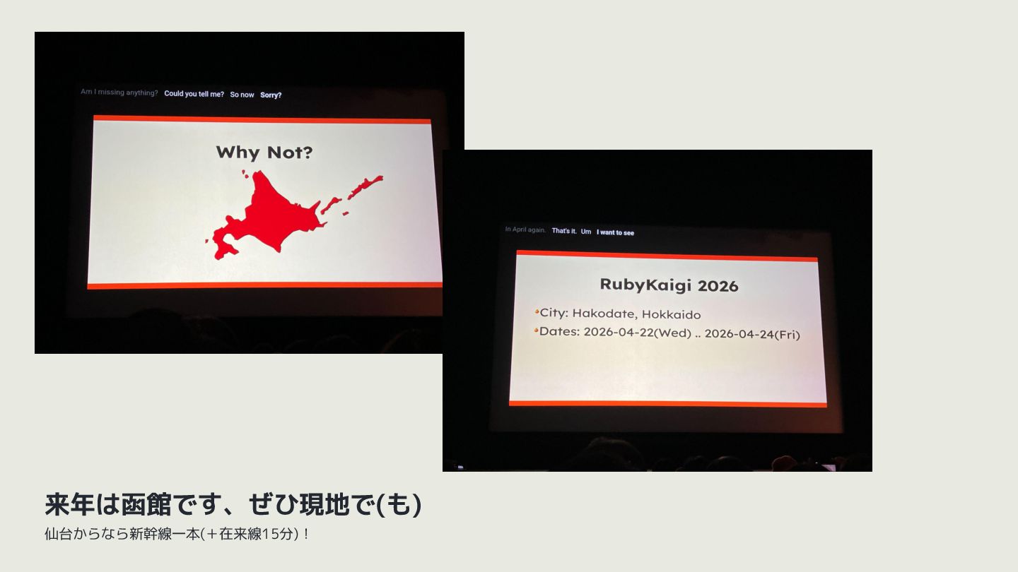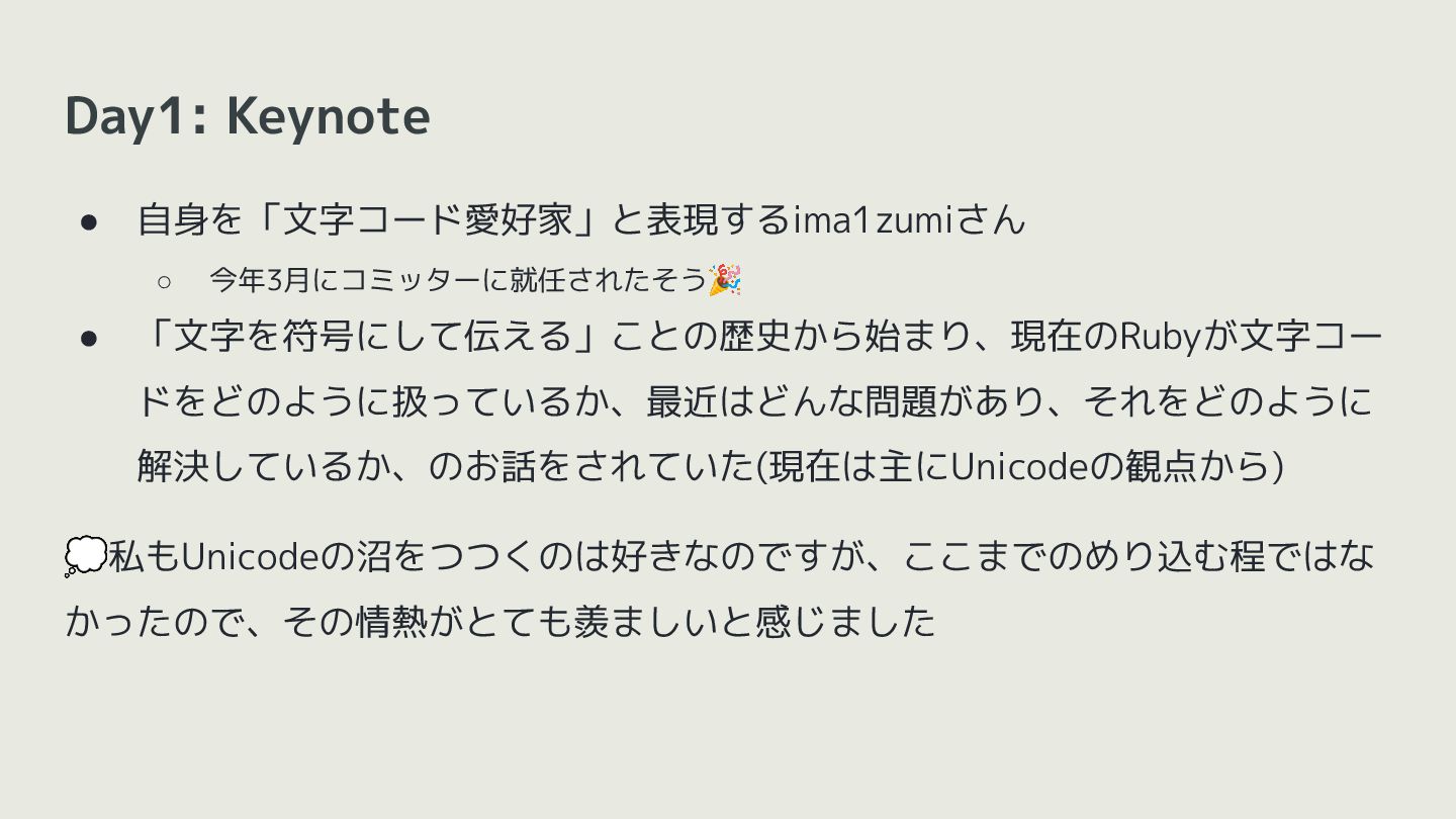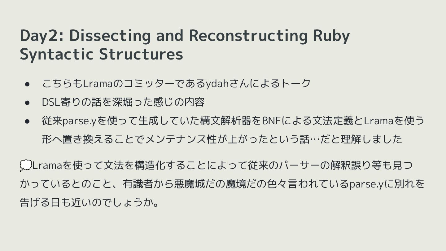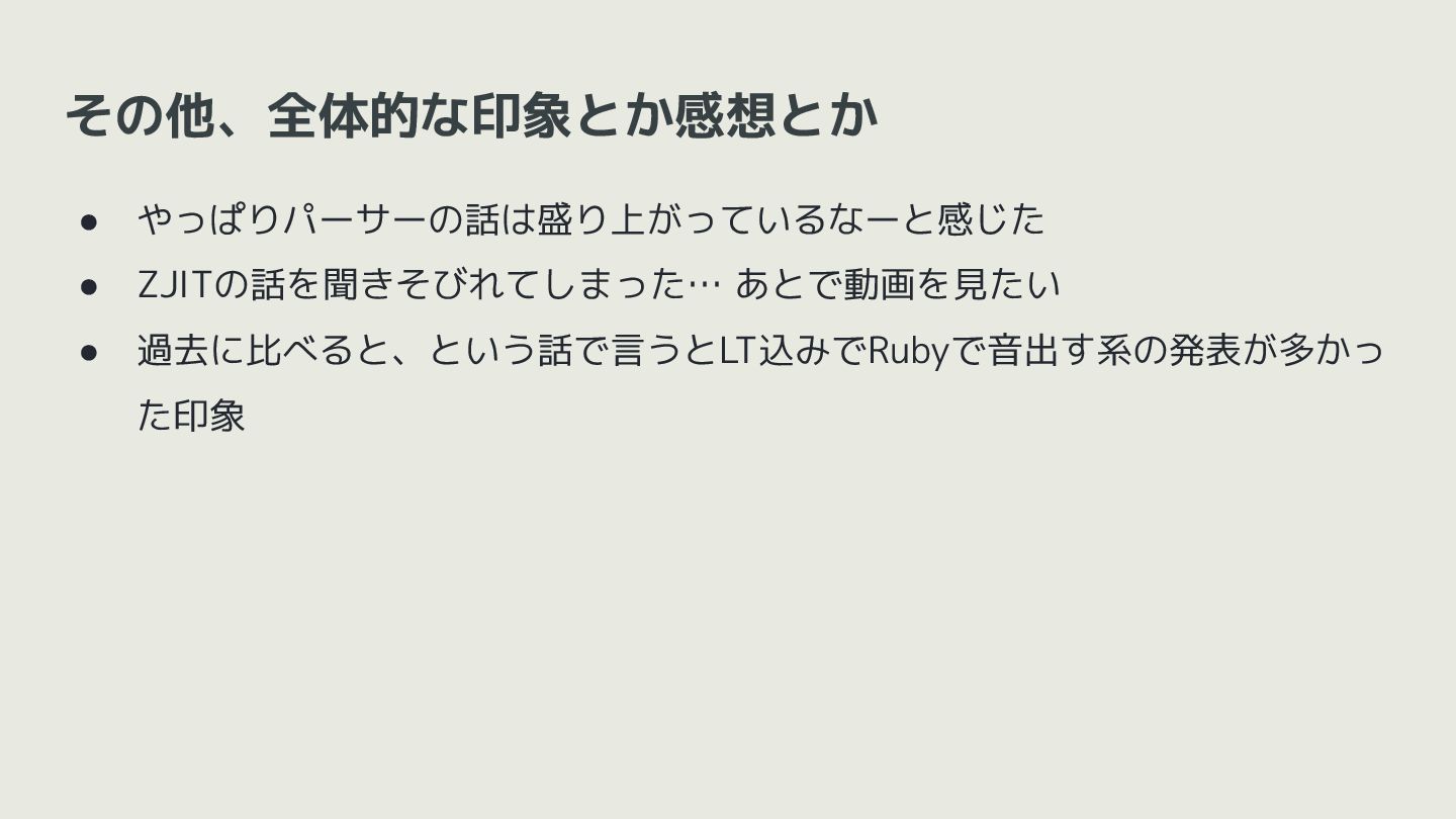 and the Worldの方だったかも) ◦ いずれにせよ今年のリリース🎅でexperimentalなNamespaceが入るとのこと 💭柔軟な文法を持ち、DSLも書きやすいらしいRuby(according to 研鑽Rubyプログラミング) は人間 の言葉との橋渡しとしてわりと向いているのでは?という観点が目から鱗でし た。「お膳立てを頑張りすぎて人間がAIにこき使われるのでは」という話題も ちょうどホットなタイミングだったので、Rubyがそういう方向で(も)発展してい くと嬉しいなぁって思います。