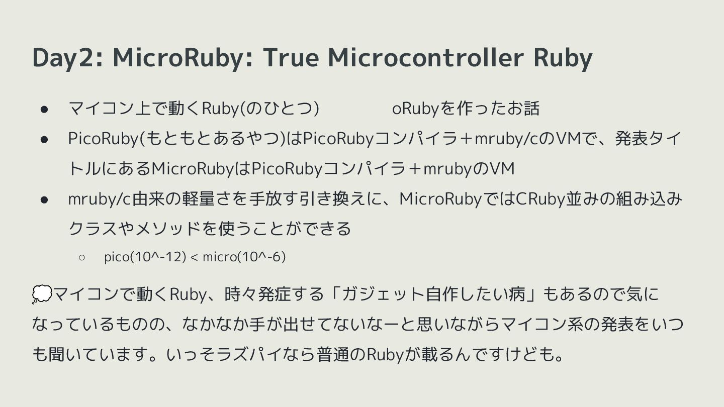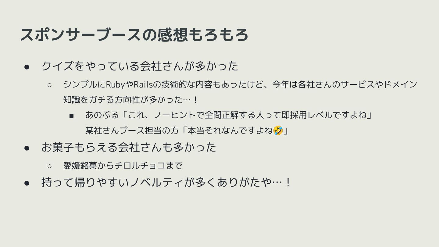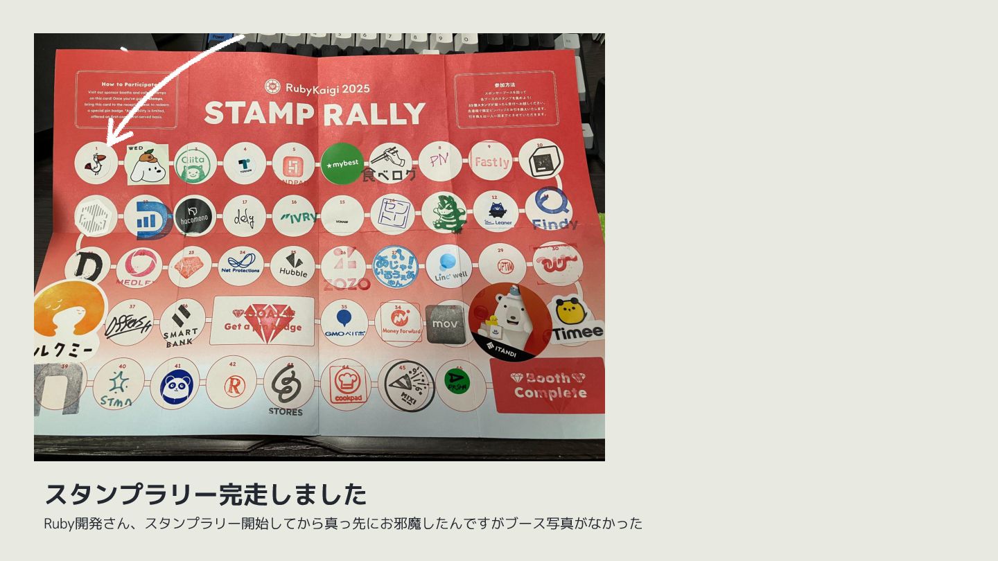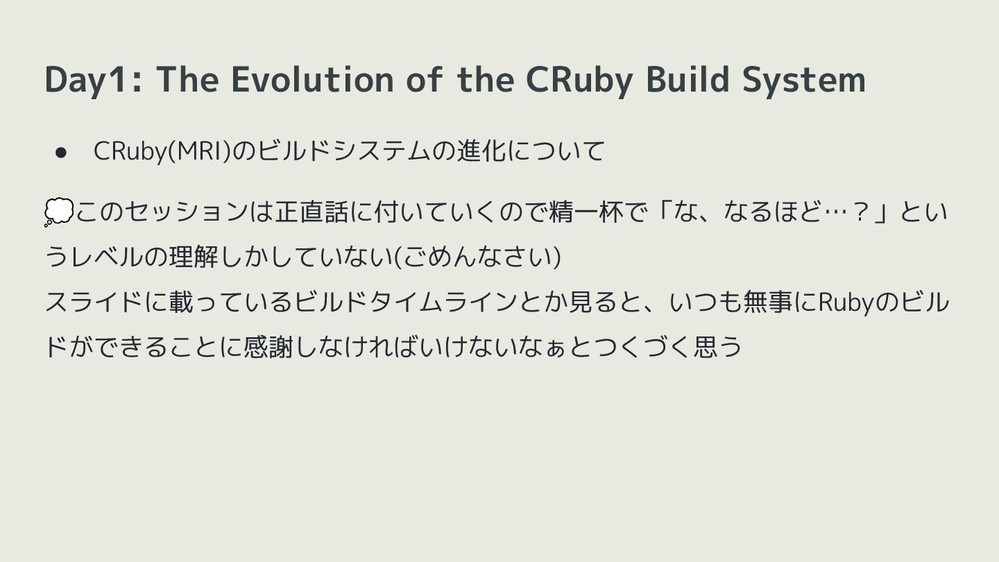 and the Worldの方だったかも) ◦ いずれにせよ今年のリリース🎅でexperimentalなNamespaceが入るとのこと 💭柔軟な文法を持ち、DSLも書きやすいらしいRuby(according to 研鑽Rubyプログラミング) は人間 の言葉との橋渡しとしてわりと向いているのでは?という観点が目から鱗でし た。「お膳立てを頑張りすぎて人間がAIにこき使われるのでは」という話題も ちょうどホットなタイミングだったので、Rubyがそういう方向で(も)発展してい くと嬉しいなぁって思います。