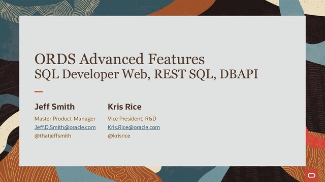 Overview of Oracle REST Data Services advanced features, including: + REST Enabled SQL + SQL Developer Web + Database Management APIs