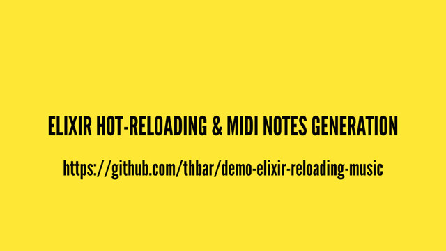 Lightning talk at ElixirConfEU 2017. Demonstrates how to use Elixir "hot-reloading" feature, together with MIDI events generation.