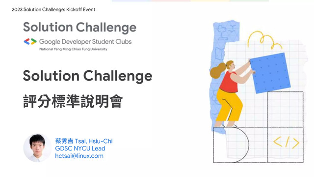 Solution Challenge 說明會 中文簡報:https://reurl.cc/580qaR 2023 Solution Challenge註冊表單:https://docs.google.com/forms/d/e/1FA... 2023 Solution Challenge - Google Developers 評分標準中文說明簡報檔案 Google Developer Student Clubs GDSC NYCU [email protected]