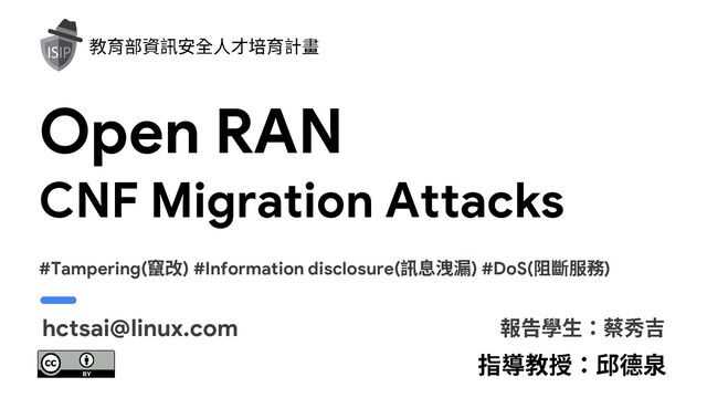 本專題簡報針對於 O-RAN O-Cloud 以及部屬在其上面的雲原生網路功能(CNF),可能會遇到的 Migration Attacks 資安威脅進行說明,並提出可能的解決方案。