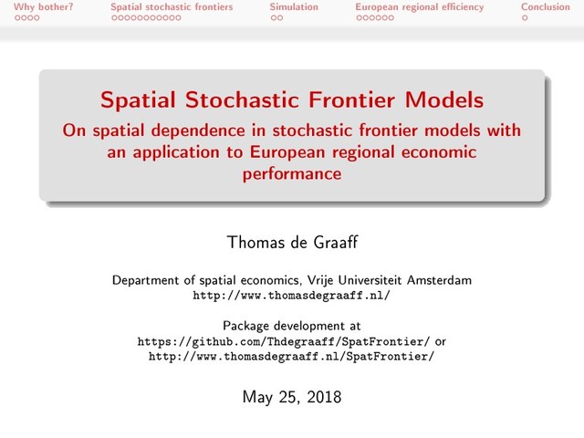 Spatial Stochastic Frontier Models On spatial dependence in stochastic frontier models with an application to European regional economic performance Thomas de Graa Department of spatial economics, Vrije Universiteit Amsterdam http://www.thomasdegraaff.nl/ Package development at https://github.com/Thdegraaff/SpatFrontier/ or http://www.thomasdegraaff.nl/SpatFrontier/ May 25, 2018