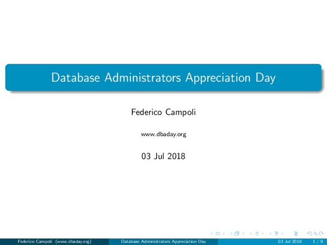 to your DBA bringing a gift. Some suggestions. Cake or Ice cream Pizza Cards Gifts Words of gratitude Let know everybody in the company how awesome is your DBA Do not deploy that migration that will shut down the database, forcing the DBA to work over the weekend in order to bring the database back Stay social! Follow https://twitter.com/dba day Share your words of appreciation on twitter, facebook, google plus using the hashtag #dbaday. Federico Campoli (www.dbaday.org) Database Administrators Appreciation Day 03 Jul 2018 6 / 9
