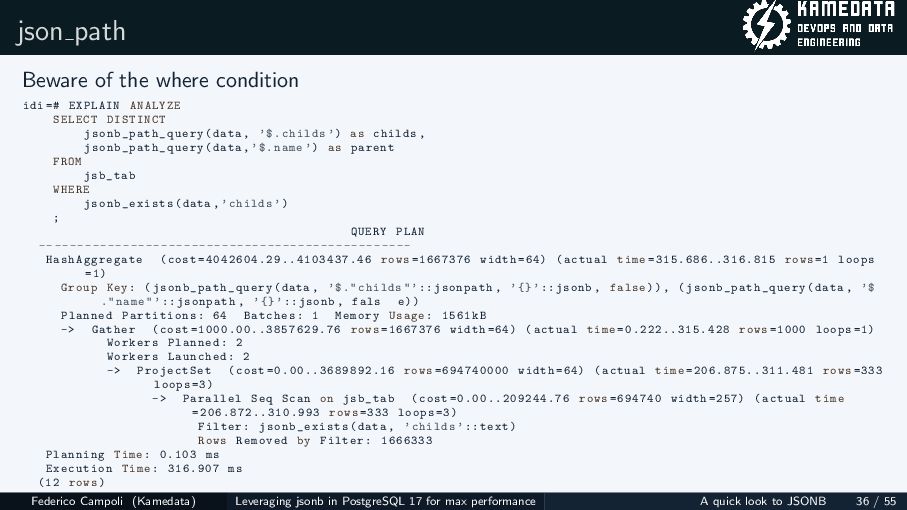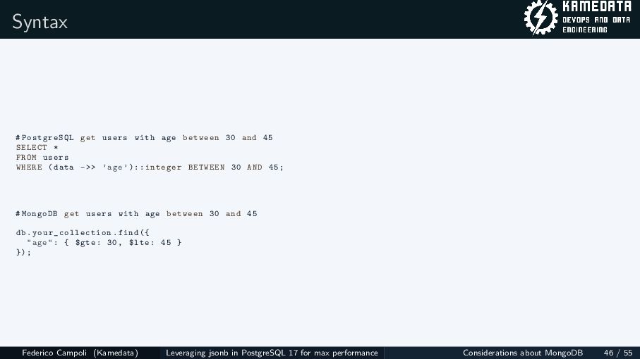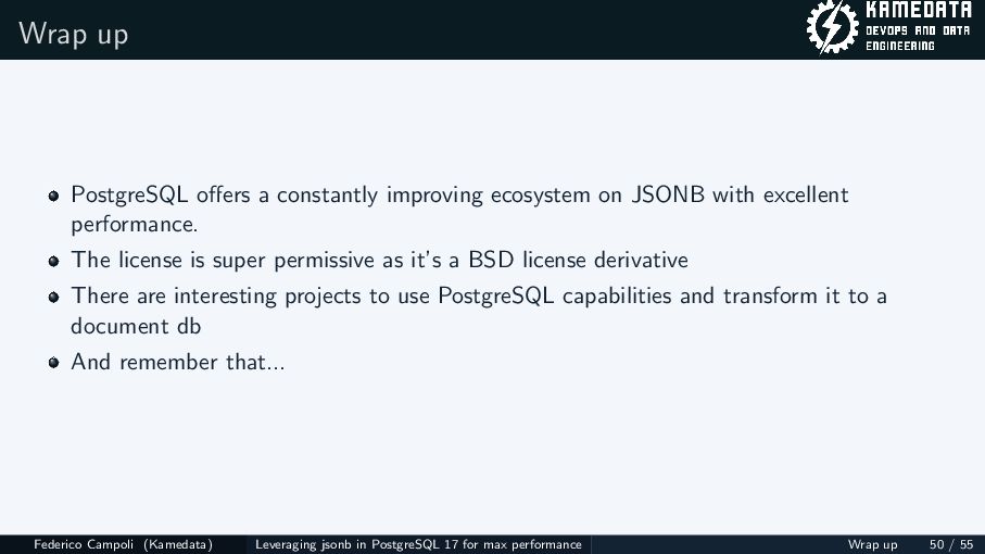 JSONB has been part of PostgreSQL since the ancient version 9.4. PostgreSQL 17's lates JSONB improvements provides a flexible and efficient way to store and query semi-structured data. Its indexing capabilities and optimized storage mechanisms make it ideal for handling large volumes of complex data, such as configuration settings, user profiles, and log data. While NoSQL databases like MongoDB have gained popularity, recent breaking changes and performance issues have raised concerns about their long-term suitability as a primary data storage solution. PostgreSQL's mature ecosystem, strong community support and proven reliability offer a compelling alternative for handling complex data workloads. The audience will learn about the JSONB functionalities available in PostgreSQL and the latest improvements making it a powerful allied to write applications at scale.