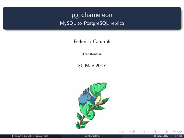 the mysqldb driver with PyMySQL Added a command line helper Installs in virtualenv and system wide Shipped via pypi for easy installation Federico Campoli (Transferwise) pg chameleon 30 May 2017 8 / 48