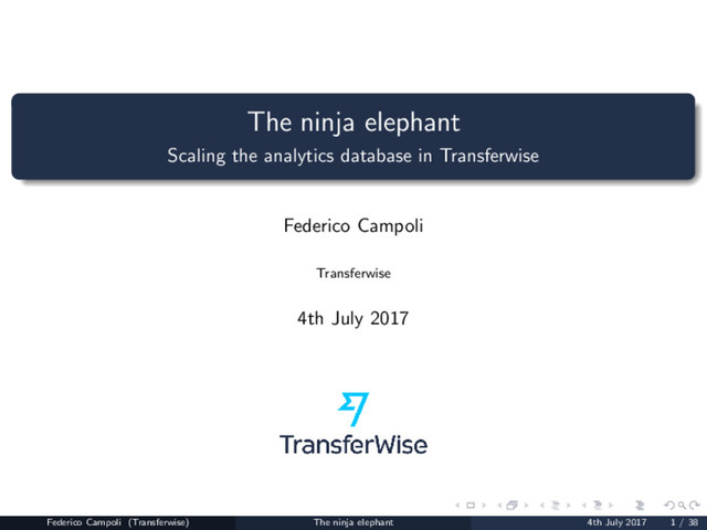 solutions. Each solution covered partially the requirements. Google BigQuery Amazon RedShift Snowflake PostgreSQL Google BigQuery and Amazon RedShift did not suffice the analytics requirements and were removed from the list. Both PostgreSQL and Snowflake offered very good performance and modern SQL. Neither of them offered a replication system from the MySQL system. Federico Campoli (Transferwise) The ninja elephant 4th July 2017 9 / 38