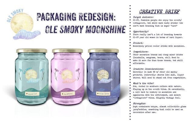 who enjoy the occult/ cottagecore, but still want heavy drinks- but don’t want branding that is super “hard” Opportunity? There really isn’t a lot of branding towards 21-28 year old women in terms of hard liquor. Product: Moderately priced cooler drinks with moonshine. Competitors: Other moonshine brands and cheap mixer drinks (buzzballs, seagrams, beers, etc). Need to make it more fun than those brands, but still affordable. Creative Considerations: Directly: In East TN w/ other old smokey products. Indirectly: stores like ALDI, liquor stores. Will need to stand out from competition. What’s the vibe? Fun, rooted in southern culture with nature. Playing up on the occult vibes. So escentially, a call back to history in moonshine and Appalachia with the environment, and modern “cottagecore” vibes. Slightly vintage feel. Strengths: Kept containers unique, almost collectible glass jars/bottles, something that could be used as decoration after use. CREATIVE BRIEF