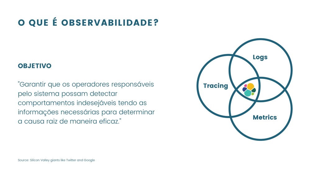 pelo sistema possam detectar comportamentos indesejáveis tendo as informações necessárias para determinar a causa raiz de maneira eficaz." Logs Metrics Tracing Source: Silicon Valley giants like Twitter and Google