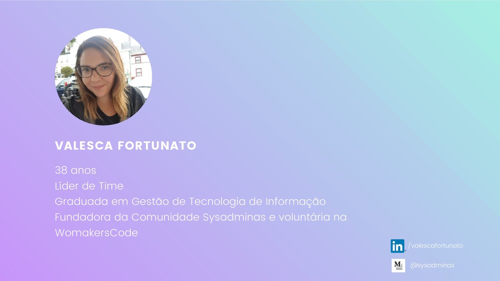 de Tecnologia de Informação Fundadora da Comunidade Sysadminas e voluntária na WomakersCode /valescafortunato @sysadminas