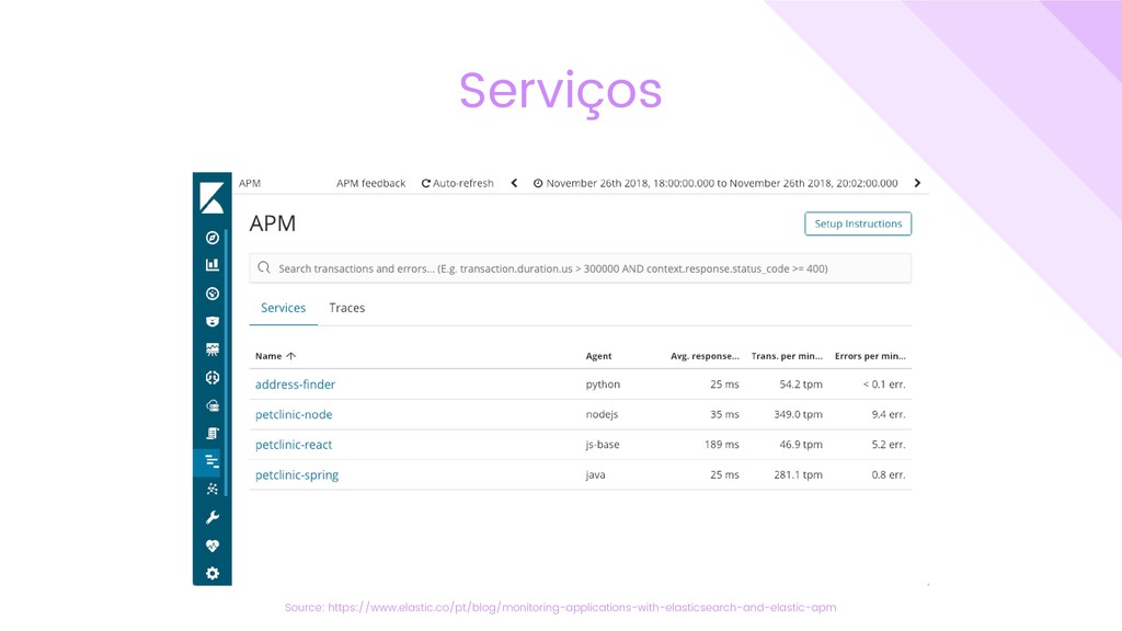 Serviços Source: https://www.elastic.co/pt/blog/monitoring-applications-with-elasticsearch-and-elastic-apm
