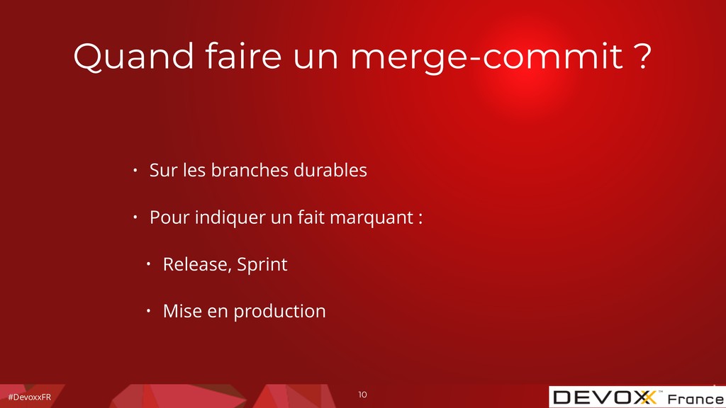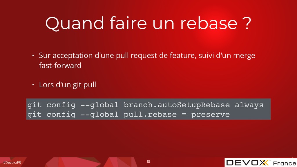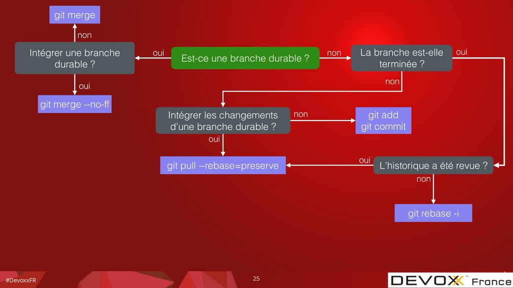 durable ? git merge --no-ff Intégrer les changements d'une branche durable ? L'historique a été revue ? non oui git merge Est-ce une branche durable ? oui non git pull --rebase=preserve git add git commit non oui non non oui git rebase -i oui