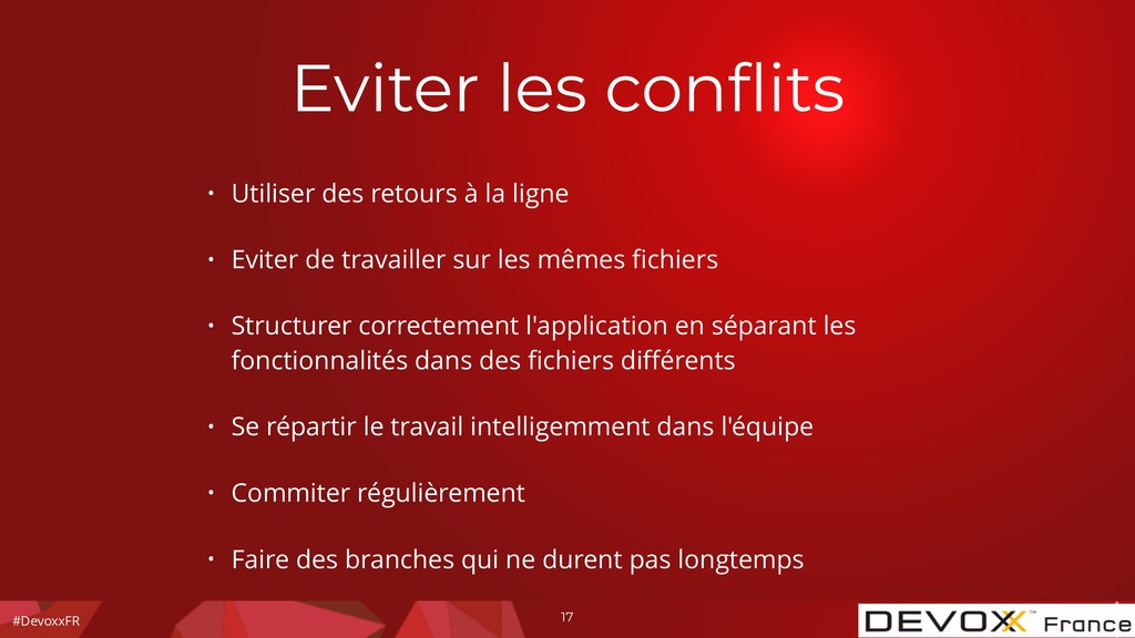 ligne • Eviter de travailler sur les mêmes fichiers • Structurer correctement l'application en séparant les fonctionnalités dans des fichiers différents • Se répartir le travail intelligemment dans l'équipe • Commiter régulièrement • Faire des branches qui ne durent pas longtemps 17