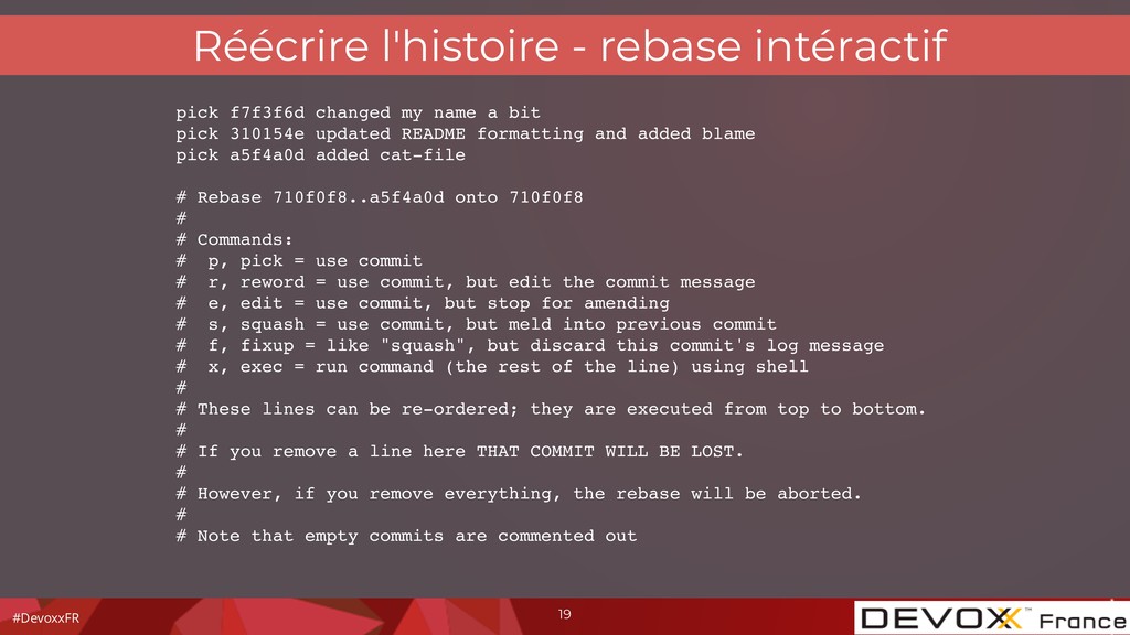 name a bit pick 310154e updated README formatting and added blame pick a5f4a0d added cat-file # Rebase 710f0f8..a5f4a0d onto 710f0f8 # # Commands: # p, pick = use commit # r, reword = use commit, but edit the commit message # e, edit = use commit, but stop for amending # s, squash = use commit, but meld into previous commit # f, fixup = like "squash", but discard this commit's log message # x, exec = run command (the rest of the line) using shell # # These lines can be re-ordered; they are executed from top to bottom. # # If you remove a line here THAT COMMIT WILL BE LOST. # # However, if you remove everything, the rebase will be aborted. # # Note that empty commits are commented out 19