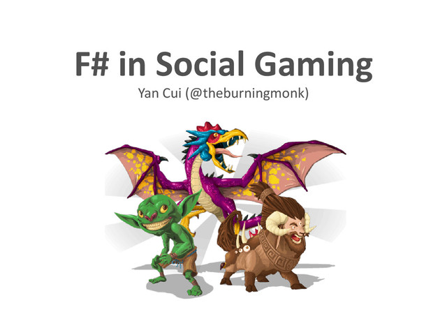 In this talk I talked about some of the use cases we have had for F# in the backend stack used to build our range of social games, and how F# has helped us achieve better 1) time to market; 2) efficiency; 3) correctness, and 4) dealing with complexity