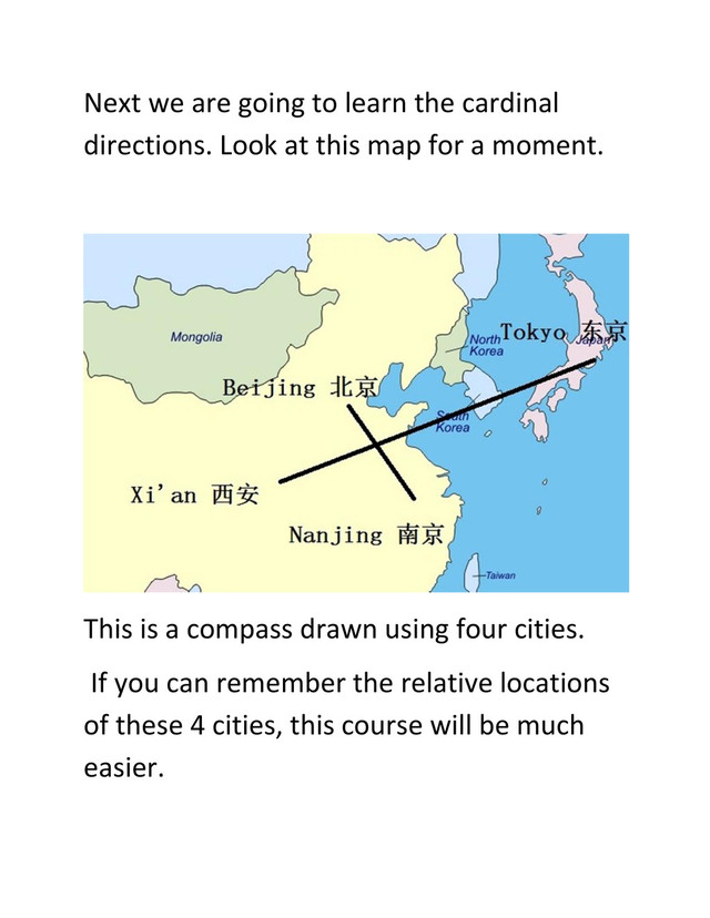 capital”. 南 nan; South. 东京;Dongjing is Tokyo. The original meaning is “Eastern capital”. (This is one of the reasons for the bad blood between China and Japan. The Chinese emperors could not accept that anyone was equal to them. After all, they were heaven’s representatives on earth). 东 dong; East. 西安 Xi’an means “Western Peace”. It was the capital of China during 5 different dynasties. 西 xi; West.