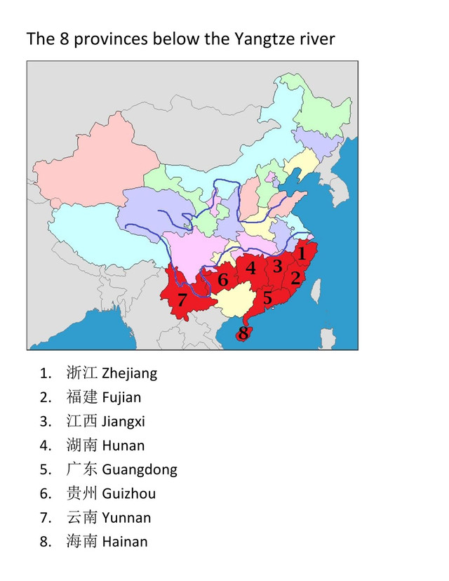 The 8 provinces below the Yangtze river 1. 浙江 Zhejiang