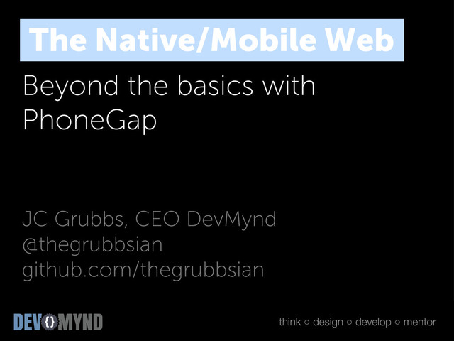 with PhoneGap JC Grubbs, CEO DevMynd @thegrubbsian github.com/thegrubbsian The Native/Mobile Web