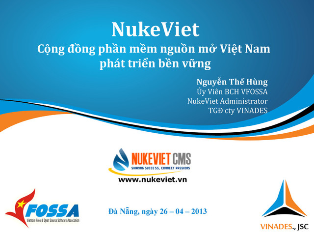 Bài trình bày của Ô. Nguyễn Thế Hùng đến từ Công ty cổ phần phát triển nguồn mở Việt Nam (VINADES) - Đại diện Cộng đồng NukeViet trong khuôn khổ chương trình HỘI THẢO ỨNG DỤNG VÀ PHÁT TRIỂN PHẦN MỀM NGUỒN MỞ 2013 (Tại điểm cầu Đà Nẵng).