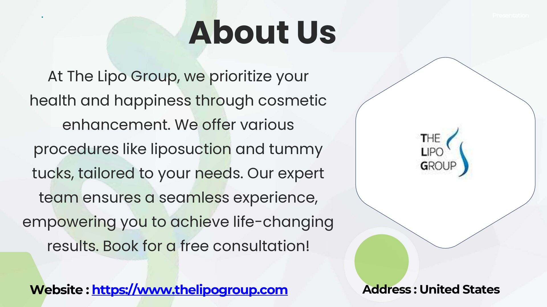health and happiness through cosmetic enhancement. We offer various procedures like liposuction and tummy tucks, tailored to your needs. Our expert team ensures a seamless experience, empowering you to achieve life-changing results. Book for a free consultation! Website : https://www.thelipogroup.com Address : United States