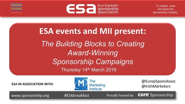 and MII present: The Building Blocks to Creating Award-Winning Sponsorship Campaigns @EuropSponsAssoc @IrishMarketers www.sponsorship.org #ESAbreakfast Thursday 14th March 2019 ESA IN ASSOCIATION WITH: Proudly hosted by