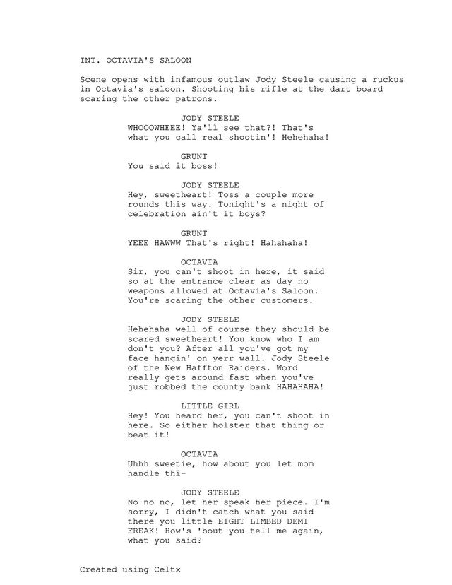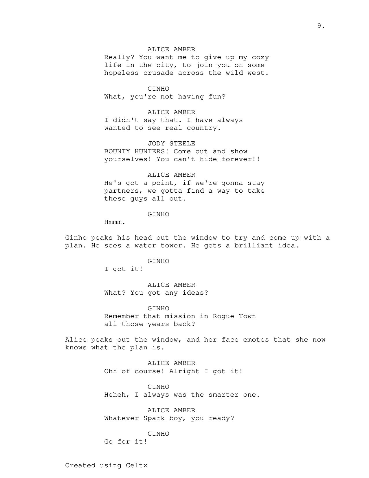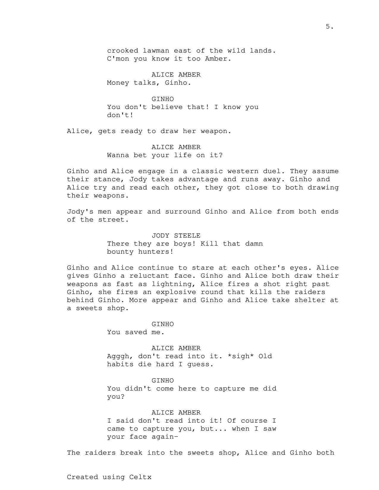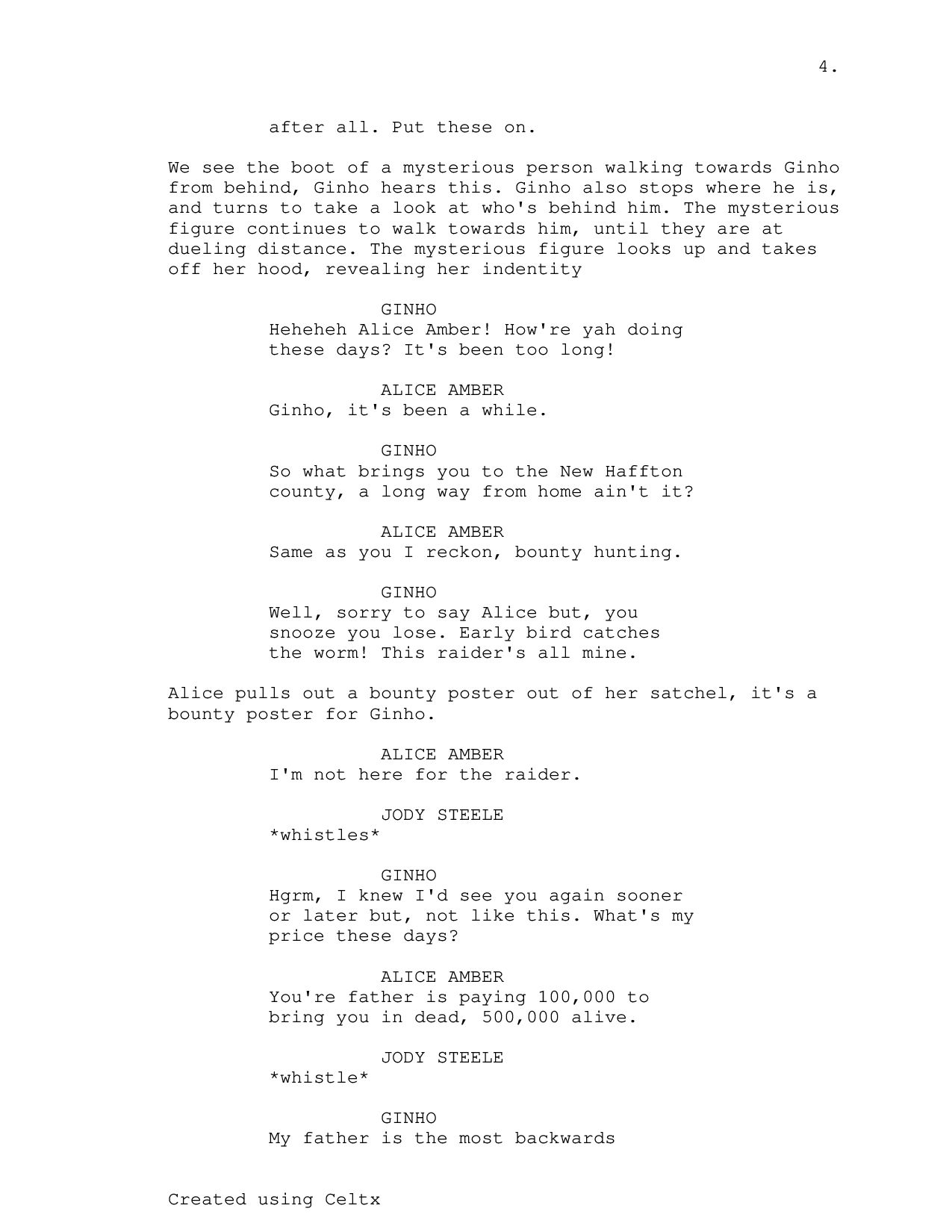 see the boot of a mysterious person walking towards Ginho from behind, Ginho hears this. Ginho also stops where he is, and turns to take a look at who's behind him. The mysterious figure continues to walk towards him, until they are at dueling distance. The mysterious figure looks up and takes off her hood, revealing her indentity GINHO Heheheh Alice Amber! How're yah doing these days? It's been too long! ALICE AMBER Ginho, it's been a while. GINHO So what brings you to the New Haffton county, a long way from home ain't it? ALICE AMBER Same as you I reckon, bounty hunting. GINHO Well, sorry to say Alice but, you snooze you lose. Early bird catches the worm! This raider's all mine. Alice pulls out a bounty poster out of her satchel, it's a bounty poster for Ginho. ALICE AMBER I'm not here for the raider. JODY STEELE *whistles* GINHO Hgrm, I knew I'd see you again sooner or later but, not like this. What's my price these days? ALICE AMBER You're father is paying 100,000 to bring you in dead, 500,000 alive. JODY STEELE *whistle* GINHO My father is the most backwards