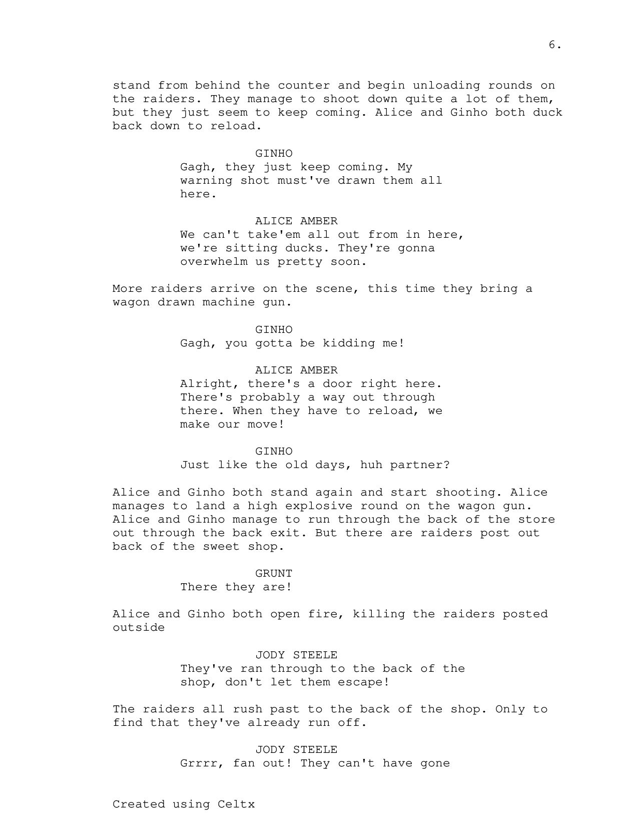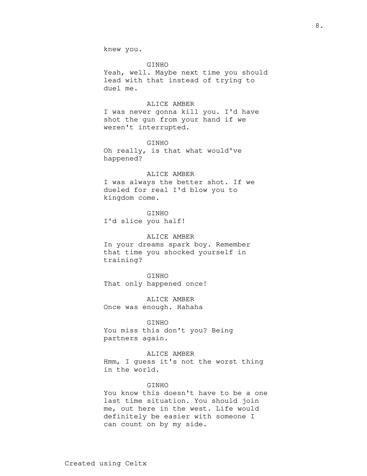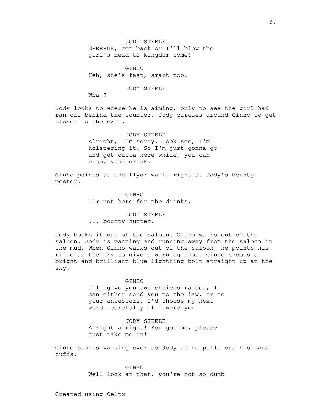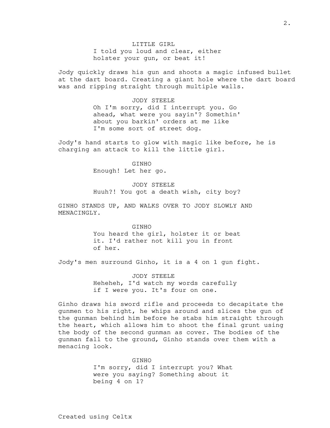 see the boot of a mysterious person walking towards Ginho from behind, Ginho hears this. Ginho also stops where he is, and turns to take a look at who's behind him. The mysterious figure continues to walk towards him, until they are at dueling distance. The mysterious figure looks up and takes off her hood, revealing her indentity GINHO Heheheh Alice Amber! How're yah doing these days? It's been too long! ALICE AMBER Ginho, it's been a while. GINHO So what brings you to the New Haffton county, a long way from home ain't it? ALICE AMBER Same as you I reckon, bounty hunting. GINHO Well, sorry to say Alice but, you snooze you lose. Early bird catches the worm! This raider's all mine. Alice pulls out a bounty poster out of her satchel, it's a bounty poster for Ginho. ALICE AMBER I'm not here for the raider. JODY STEELE *whistles* GINHO Hgrm, I knew I'd see you again sooner or later but, not like this. What's my price these days? ALICE AMBER You're father is paying 100,000 to bring you in dead, 500,000 alive. JODY STEELE *whistle* GINHO My father is the most backwards