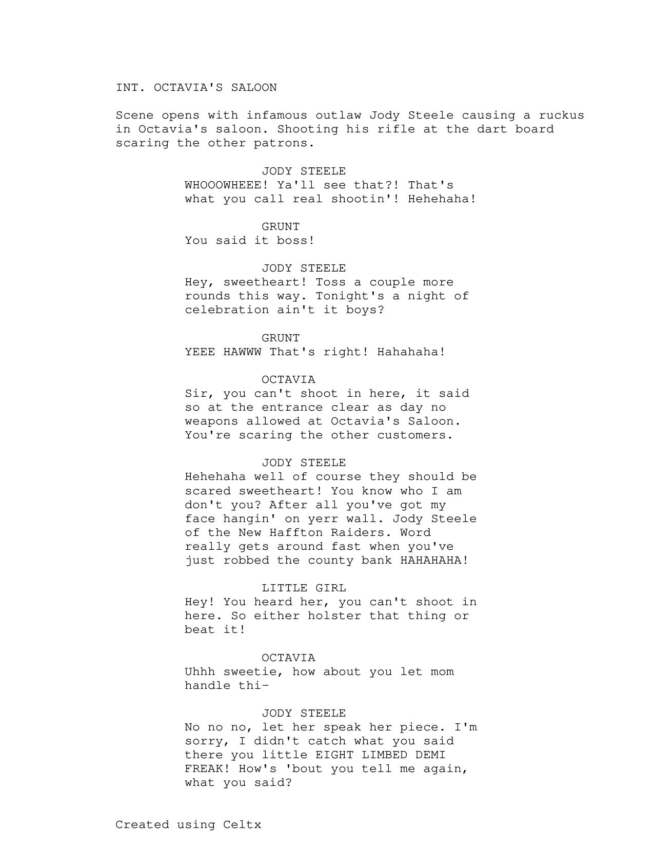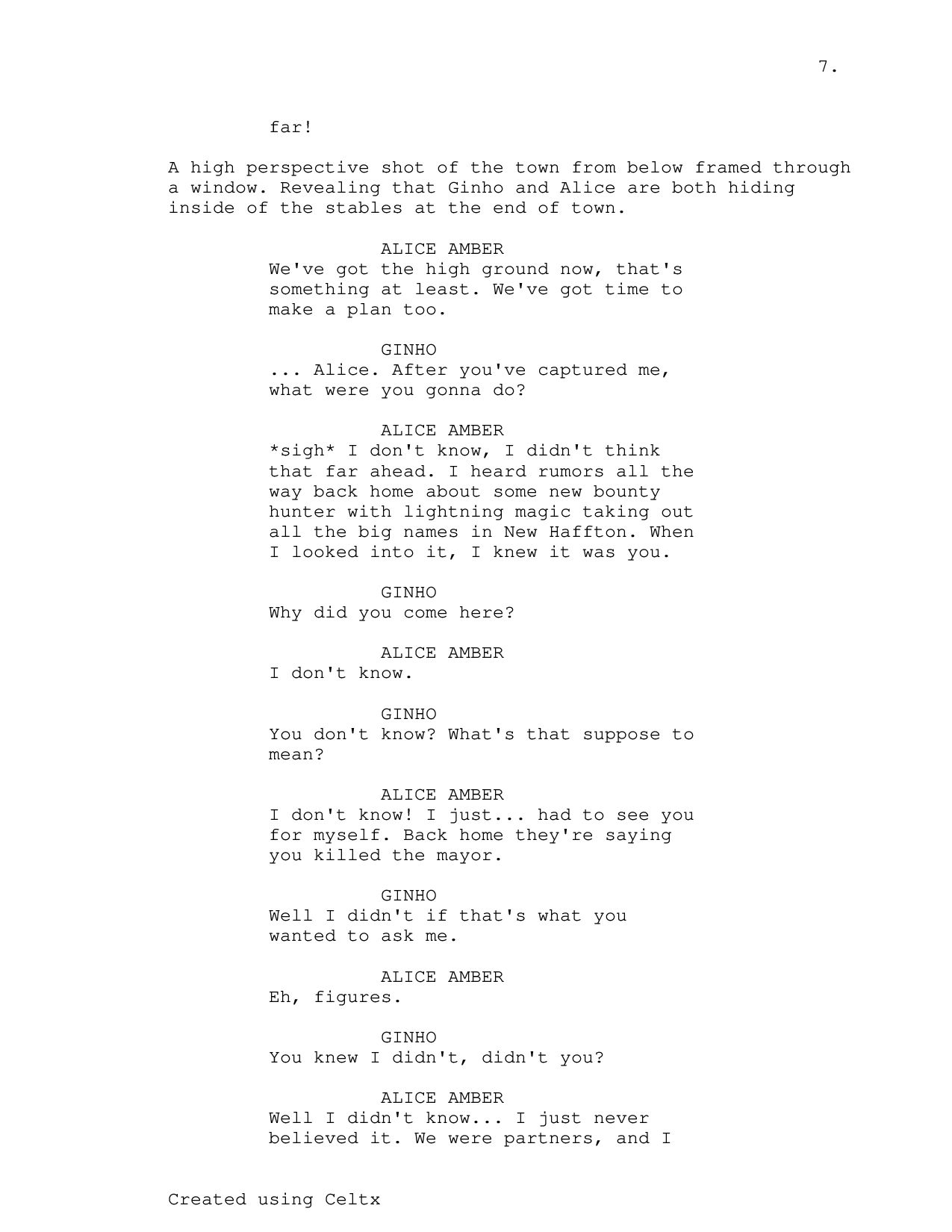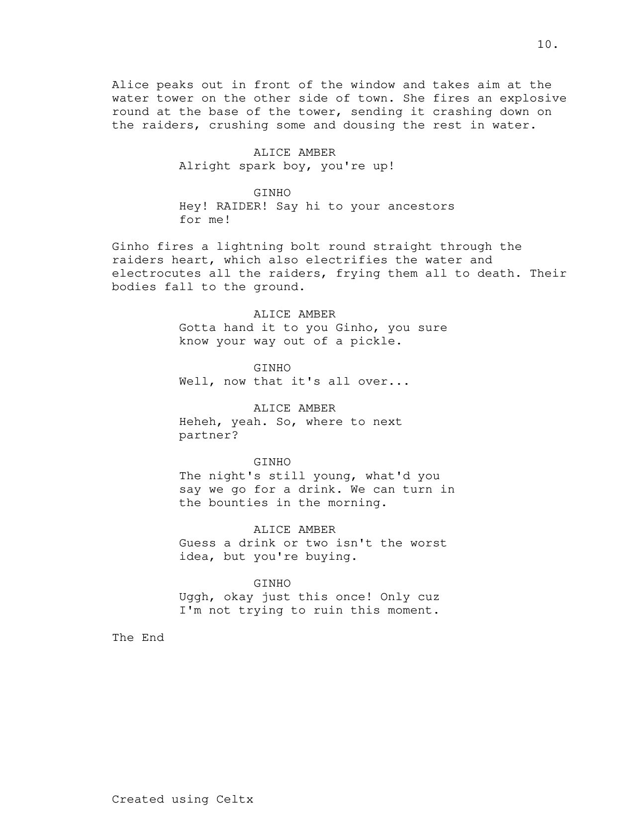 see the boot of a mysterious person walking towards Ginho from behind, Ginho hears this. Ginho also stops where he is, and turns to take a look at who's behind him. The mysterious figure continues to walk towards him, until they are at dueling distance. The mysterious figure looks up and takes off her hood, revealing her indentity GINHO Heheheh Alice Amber! How're yah doing these days? It's been too long! ALICE AMBER Ginho, it's been a while. GINHO So what brings you to the New Haffton county, a long way from home ain't it? ALICE AMBER Same as you I reckon, bounty hunting. GINHO Well, sorry to say Alice but, you snooze you lose. Early bird catches the worm! This raider's all mine. Alice pulls out a bounty poster out of her satchel, it's a bounty poster for Ginho. ALICE AMBER I'm not here for the raider. JODY STEELE *whistles* GINHO Hgrm, I knew I'd see you again sooner or later but, not like this. What's my price these days? ALICE AMBER You're father is paying 100,000 to bring you in dead, 500,000 alive. JODY STEELE *whistle* GINHO My father is the most backwards