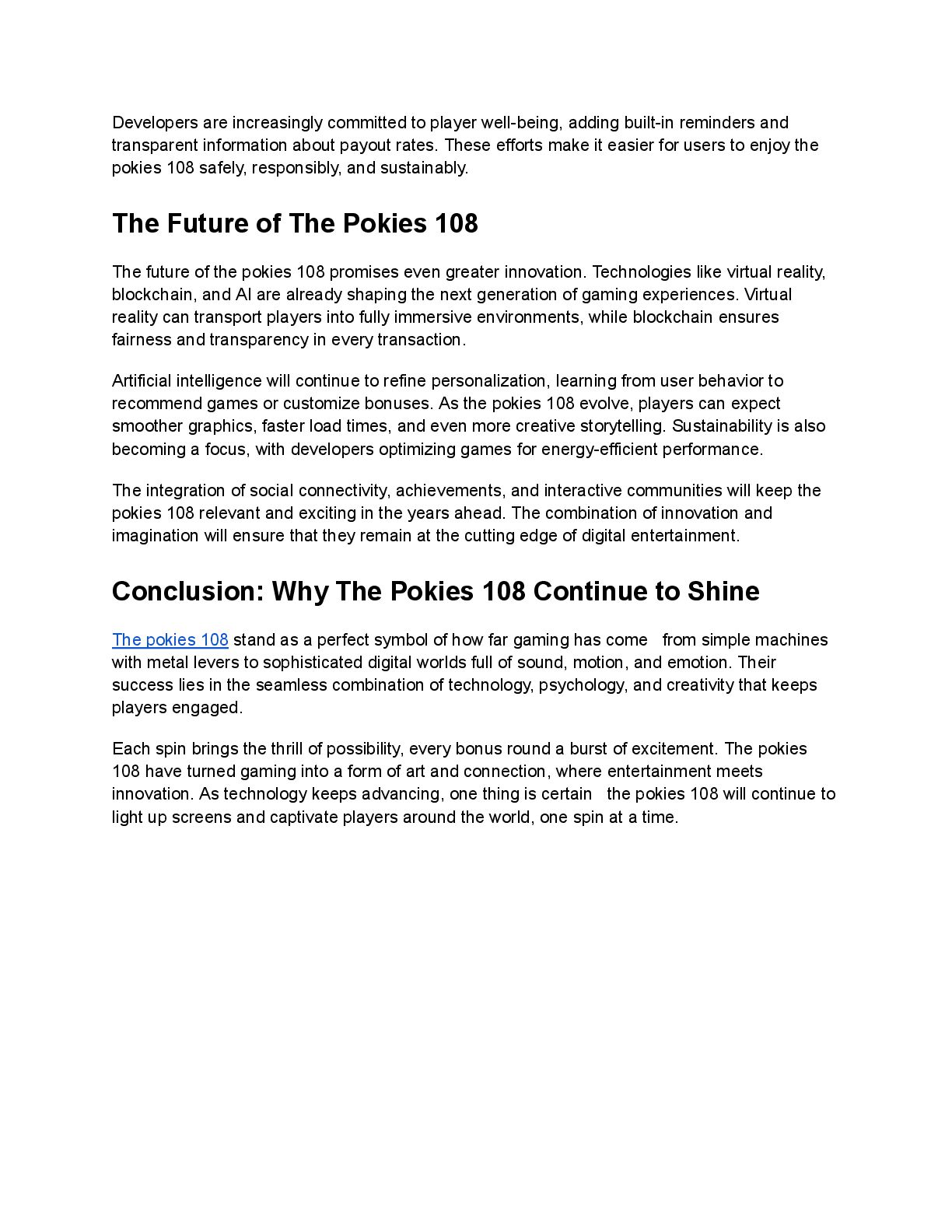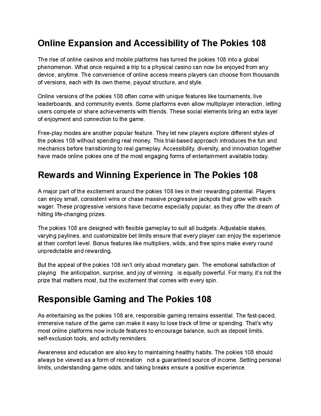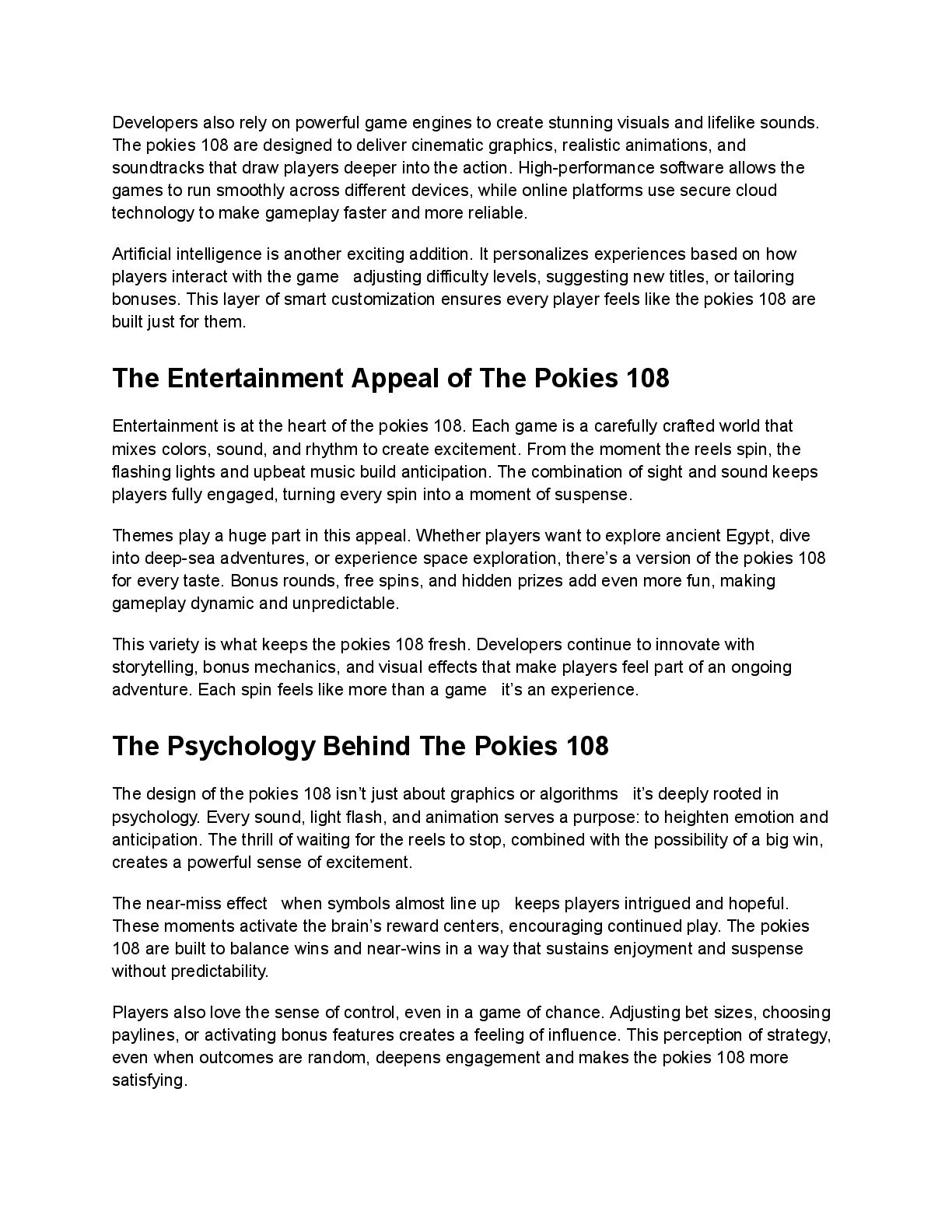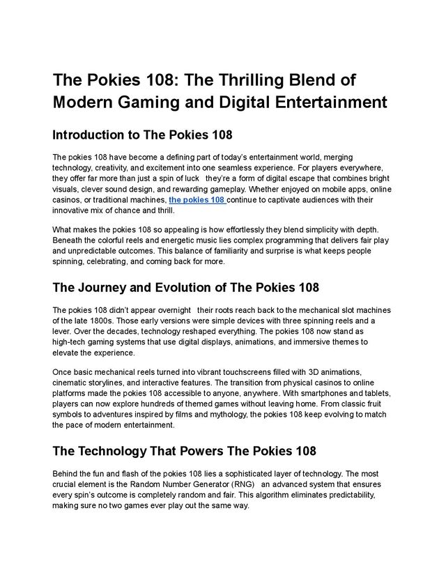 visuals and lifelike sounds. The pokies 108 are designed to deliver cinematic graphics, realistic animations, and soundtracks that draw players deeper into the action. High-performance software allows the games to run smoothly across different devices, while online platforms use secure cloud technology to make gameplay faster and more reliable. Artificial intelligence is another exciting addition. It personalizes experiences based on how players interact with the game adjusting difficulty levels, suggesting new titles, or tailoring bonuses. This layer of smart customization ensures every player feels like the pokies 108 are built just for them. The Entertainment Appeal of The Pokies 108 Entertainment is at the heart of the pokies 108. Each game is a carefully crafted world that mixes colors, sound, and rhythm to create excitement. From the moment the reels spin, the flashing lights and upbeat music build anticipation. The combination of sight and sound keeps players fully engaged, turning every spin into a moment of suspense. Themes play a huge part in this appeal. Whether players want to explore ancient Egypt, dive into deep-sea adventures, or experience space exploration, there’s a version of the pokies 108 for every taste. Bonus rounds, free spins, and hidden prizes add even more fun, making gameplay dynamic and unpredictable. This variety is what keeps the pokies 108 fresh. Developers continue to innovate with storytelling, bonus mechanics, and visual effects that make players feel part of an ongoing adventure. Each spin feels like more than a game it’s an experience. The Psychology Behind The Pokies 108 The design of the pokies 108 isn’t just about graphics or algorithms it’s deeply rooted in psychology. Every sound, light flash, and animation serves a purpose: to heighten emotion and anticipation. The thrill of waiting for the reels to stop, combined with the possibility of a big win, creates a powerful sense of excitement. The near-miss effect when symbols almost line up keeps players intrigued and hopeful. These moments activate the brain’s reward centers, encouraging continued play. The pokies 108 are built to balance wins and near-wins in a way that sustains enjoyment and suspense without predictability. Players also love the sense of control, even in a game of chance. Adjusting bet sizes, choosing paylines, or activating bonus features creates a feeling of influence. This perception of strategy, even when outcomes are random, deepens engagement and makes the pokies 108 more satisfying.
