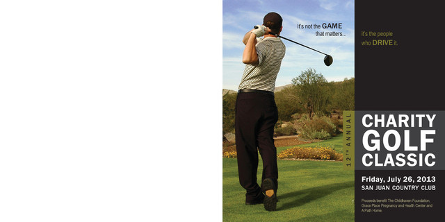 victims of abuse and abandonment, so they may have the opportunity to achieve their full potential. Childhaven’s mission is to lift children from crisis to hope. Childhaven provides comprehensive community support services, safe houses, foster care and emergency shelter, outpatient therapy and court appointed special advocates (CASA). Grace Place Pregnancy and Health Center offers hope and help to youth, women and children in need. Affirming life in every situation, Grace Place encourages healthy lifestyle choices and offers healing and wholeness by providing pregnancy testing and counseling, post- abortion counseling, parenting classes and abstinence education. A Path Home (a project of the Four Corners Foundation) is a master planned development and transitional housing project for homeless individuals and families. A Path Home will replace the current outdated and inadequate PATH-- People Assisting the Homeless facility, which has served our community since 1983. Our annual Charity Golf Classic tournament raises funds, resources and volunteer labor to meet physical and emotional needs in San Juan County. This year‘s proceeds will benefit these worthy organizations: A complimentary continental breakfast will be available before the tournament. Awards will be presented on the patio, immediately following the tournament. We also have opportunities for prize sponsors. Contact Brad Salzman at 505.486.1701 for more information. Please return the enclosed registration form and payment by Friday, July 5, 2013. CHARITY GOLF CLASSIC 1 2 t h A n n u a l Will YOU be an advocate for San Juan County? Will you be a SPONSOR in our 2013 tournament? Our 12th Annual Charity Golf Classic will be held Friday, July 26, 2013 at San Juan Country Club. Shotgun start at 7:00 AM (registration opens at 6:15 AM). Sponsorship opportunities include: TITLE SPONSOR..............................................................................$5,000 • Two four-man teams (includes green fees, golf carts and range balls) • Catered BBQ lunch, provided by San Juan Country Club • Invitation to Sponsor Crawfish Boil on Thursday, July 25, 2013 • Prime advertising on location as well as in pre-and post-event promotions • Recognition in Majestic Living Magazine, PinonHillsCharities.org and social media PLATINUM SPONSOR.....................................................................$2,500 • One four-man team (includes green fees, golf carts and range balls) • Catered BBQ lunch, provided by San Juan Country Club • Invitation to Sponsor Crawfish Boil on Thursday, July 25, 2013 • Prime advertising on location as well as in pre-and post-event promotions • Recognition in Majestic Living Magazine, PinonHillsCharities.org and social media GOLD SPONSOR.............................................................................$1,500 • One four-man team (includes green fees, golf carts and range balls) • Catered BBQ lunch, provided by San Juan Country Club • Advertising on location as well as in pre-and post-event promotions • Recognition in Majestic Living Magazine, PinonHillsCharities.org and social media