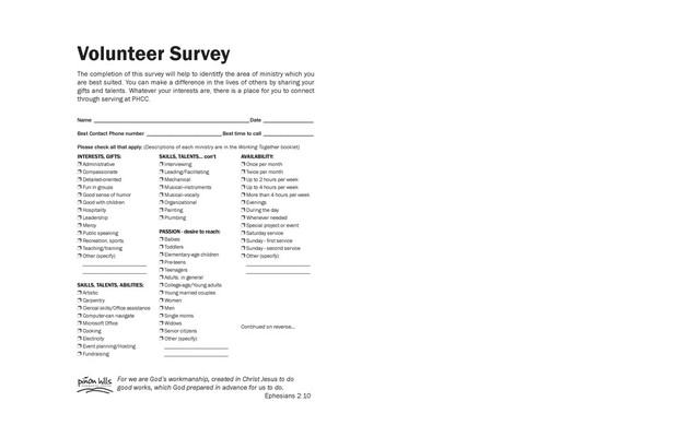 area of ministry which you are best suited. You can make a difference in the lives of others by sharing your gifts and talents. Whatever your interests are, there is a place for you to connect through serving at PHCC. Name_________________________________________________________Date___________________ Best Contact Phone number____________________________ Best time to call___________________ Please check all that apply: (Descriptions of each ministry are in the Working Together booklet) INTERESTS, GIFTS: p Administrative p Compassionate p Detailed-oriented p Fun in groups p Good sense of humor p Good with children p Hospitality p Leadership p Mercy p Public speaking p Recreation, sports p Teaching/training p Other (specify): ________________________ ________________________ SKILLS, TALENTS, ABILITIES: p Artistic p Carpentry p Clerical skills/Office assistance p Computer-can navigate p Microsoft Office p Cooking p Electricity p Event planning/Hosting p Fundraising SKILLS, TALENTS... con’t p Interviewing p Leading/Facilitating p Mechanical p Musical--instruments p Musical--vocally p Organizational p Painting p Plumbing PASSION - desire to reach: p Babies p Toddlers p Elementary-age children p Pre-teens p Teenagers p Adults, in general p College-age/Young adults p Young married couples p Women p Men p Single moms p Widows p Senior citizens p Other (specify): ________________________ ________________________ AVAILABILITY: p Once per month p Twice per month p Up to 2 hours per week p Up to 4 hours per week p More than 4 hours per week p Evenings p During the day p Whenever needed p Special project or event p Saturday service p Sunday - first service p Sunday - second service p Other (specify): ________________________ ________________________ Continued on reverse... Volunteer Survey For we are God’s workmanship, created in Christ Jesus to do good works, which God prepared in advance for us to do. Ephesians 2:10