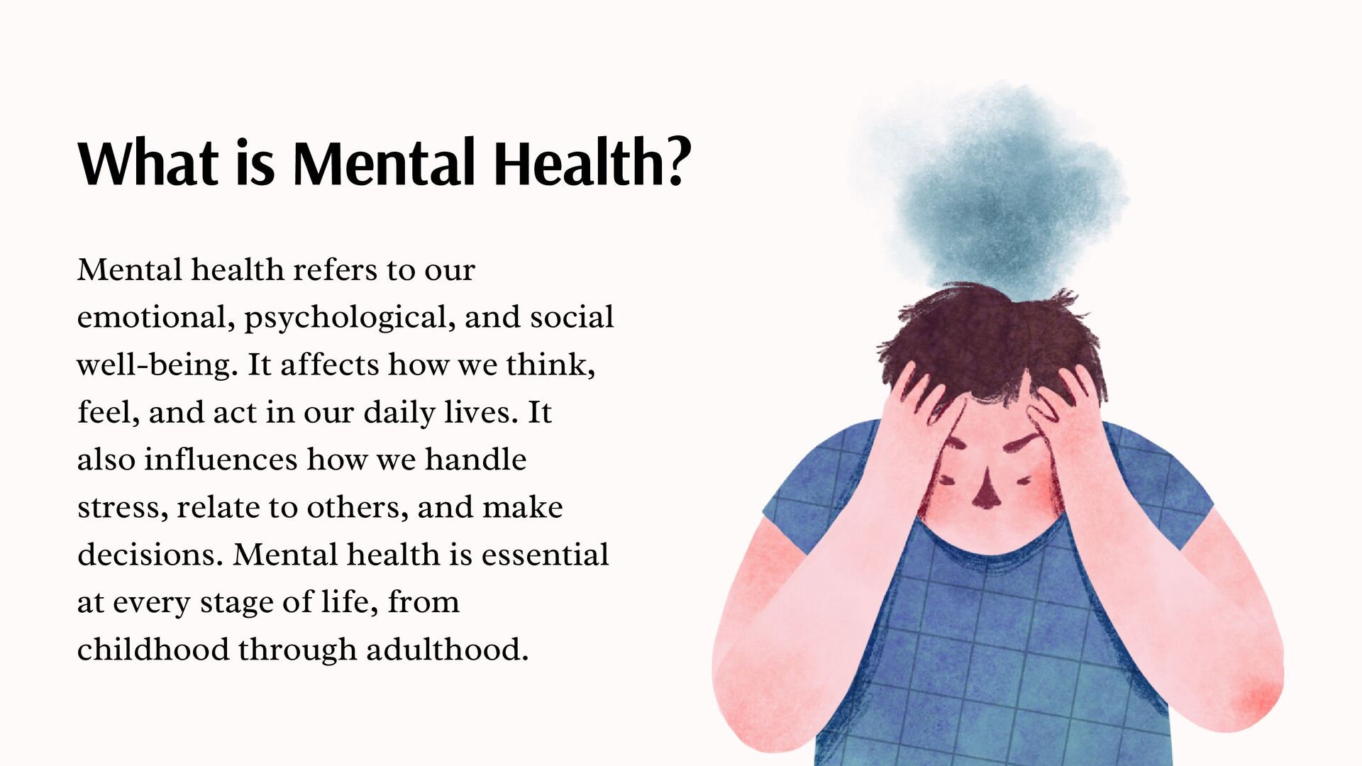 Mental health refers to our emotional, psychological, and social well-being. It affects how we think, feel, and act in our daily lives. It also influences how we handle stress, relate to others, and make decisions. Mental health is essential at every stage of life, from childhood through adulthood.