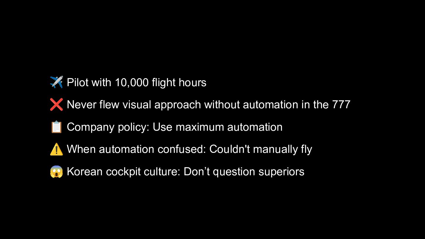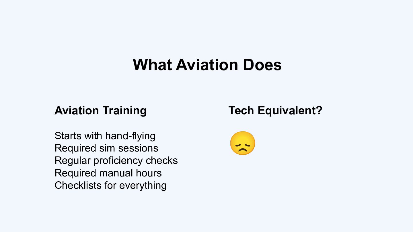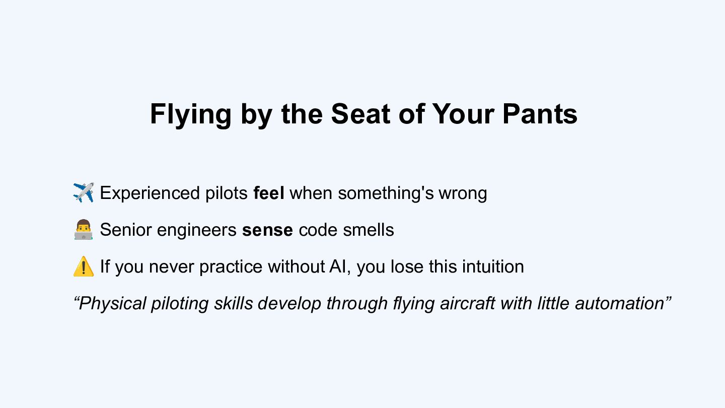 Through case studies including US Airways 1549 ("Miracle on the Hudson"), Air France 447, and Asiana 214, the talk explores the automation paradox: the more reliable our tools become, the less prepared we are when they fail. The same risks apply to software engineers who over-rely on AI - hallucinated libraries, atrophied skills, automation bias, and the slow erosion of the "code smell" intuition that only comes from practice.