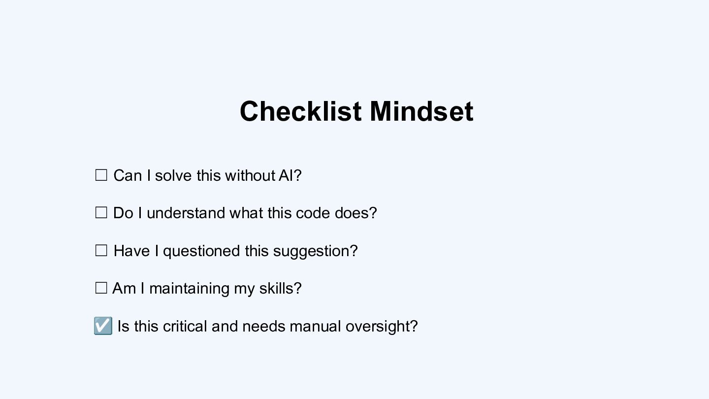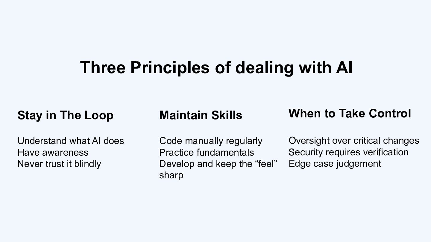 The talk closes with three practical principles for navigating AI-assisted development: staying in the loop, maintaining your fundamentals, and knowing when to take manual control.